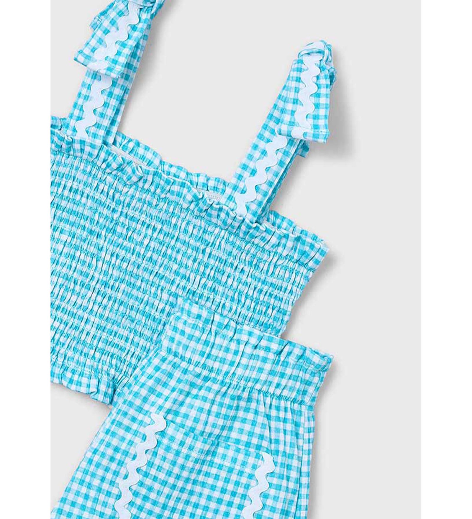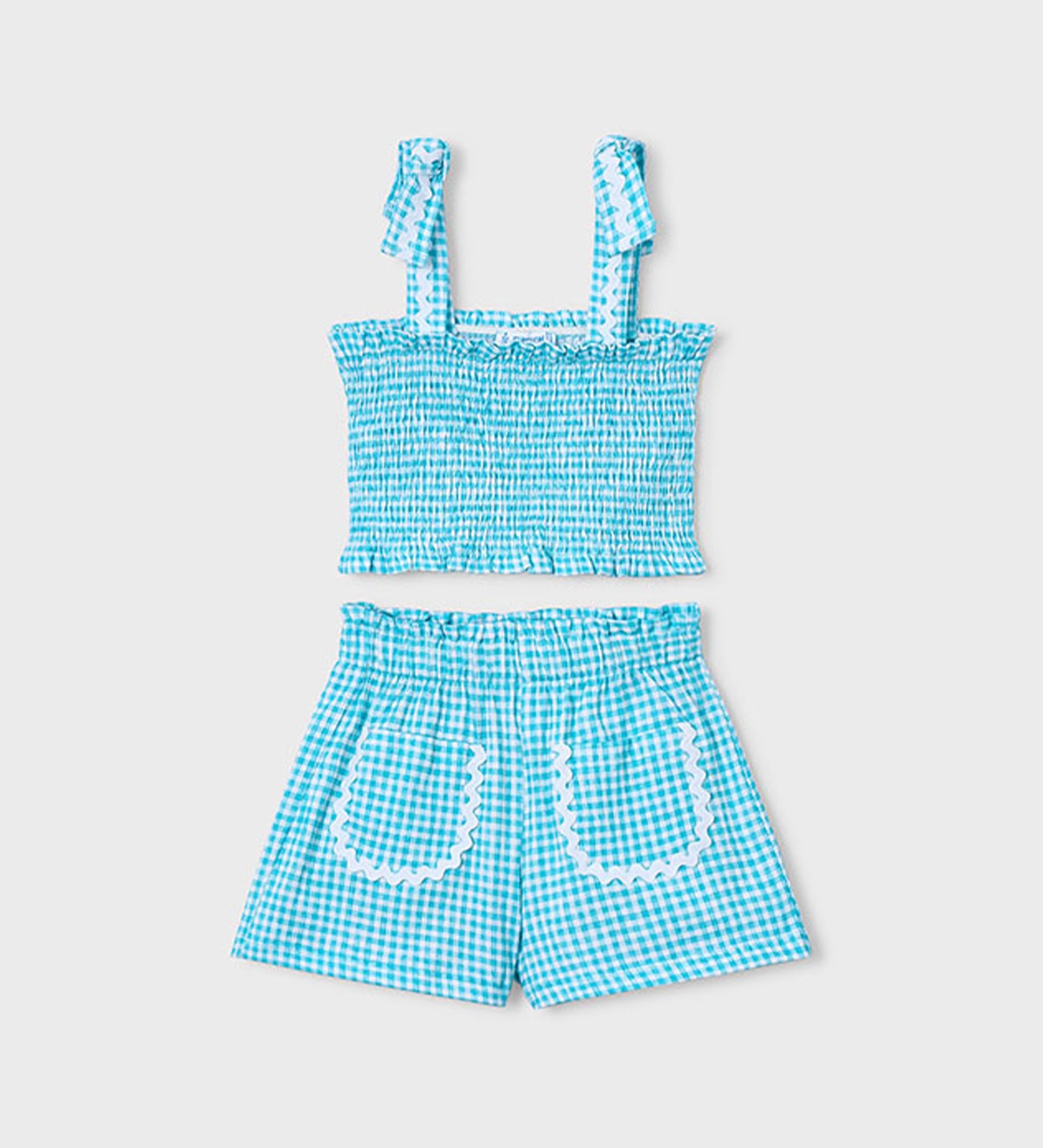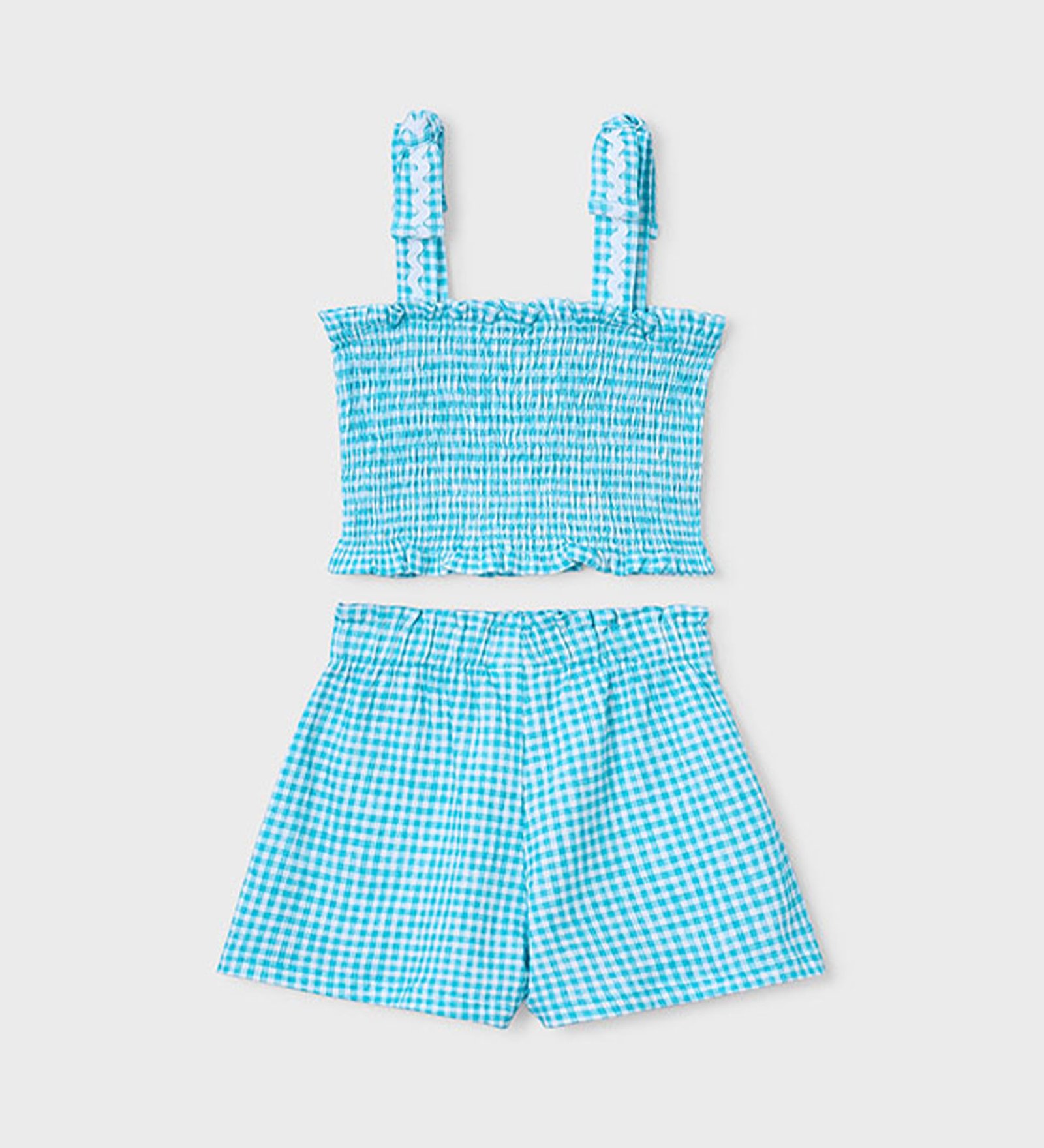 Παιδικό καλοκαιρινό σετ δύο τεμαχίων, ιδανικό για δροσερές και παιχνιδιάρικες εμφανίσεις. Αποτελείται από αμάνικο τοπ με σφηκοφωλιά για άνετη εφαρμογή και δετές τιράντες, που προσφέρουν σταθερότητα και στιλ. Το σορτσάκι διαθέτει ελαστική μέση για ευκολία στην κίνηση και χαριτωμένες μπροστινές τσέπες με διακοσμητική λεπτομέρεια. Το καρό μοτίβο χαρίζει καλοκαιρινή διάθεση, ενώ το απαλό ύφασμα το καθιστά ιδανικό για όλη την ημέρα, από τη βόλτα μέχρι το παιχνίδι. Ένα άνετο και κομψό σετ που δεν πρέπει να λείπει από την παιδική γκαρνταρόμπα.