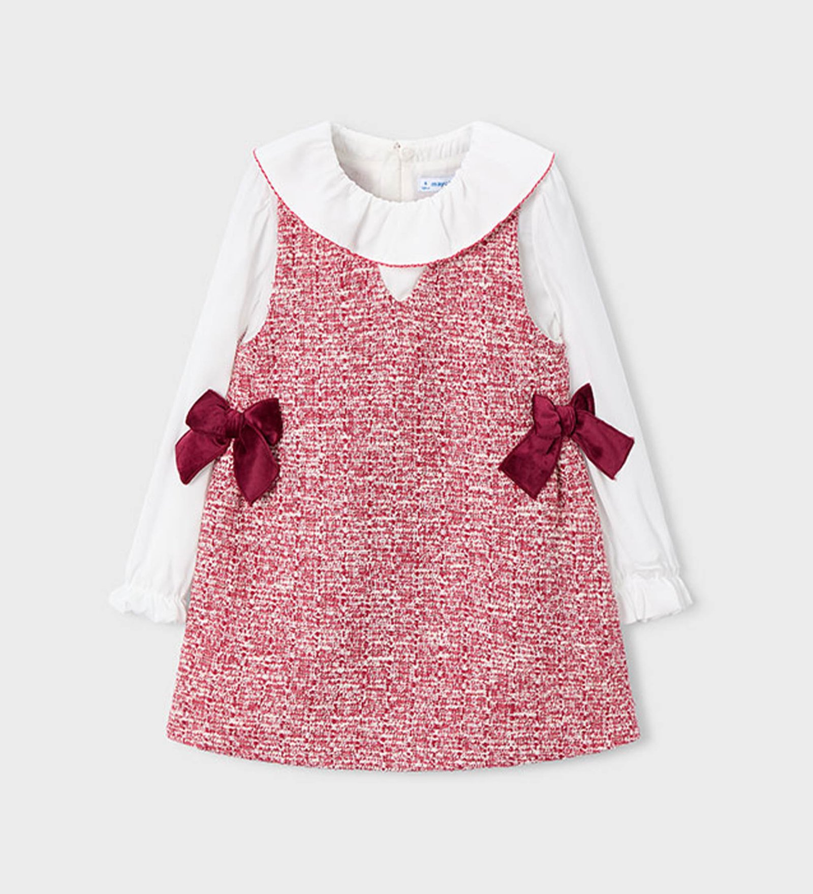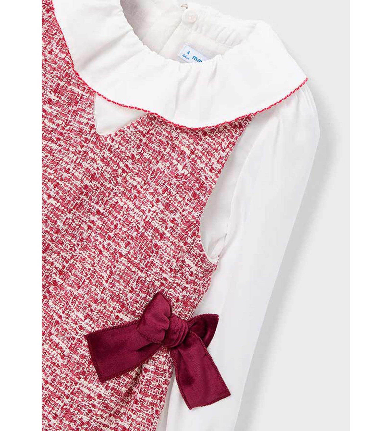 “Mayoral” Πλεκτό κόκκινο με λευκά μανίκια φόρεμα habilleuse με φιόγκους και γιακά. Ιδανική επιλογή για γενέθλια και events.