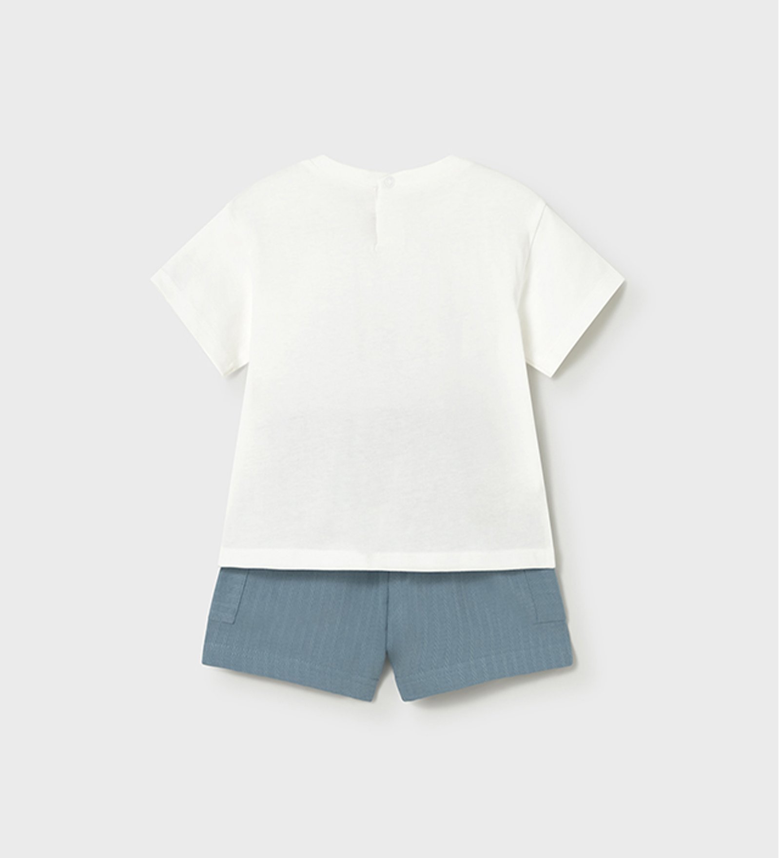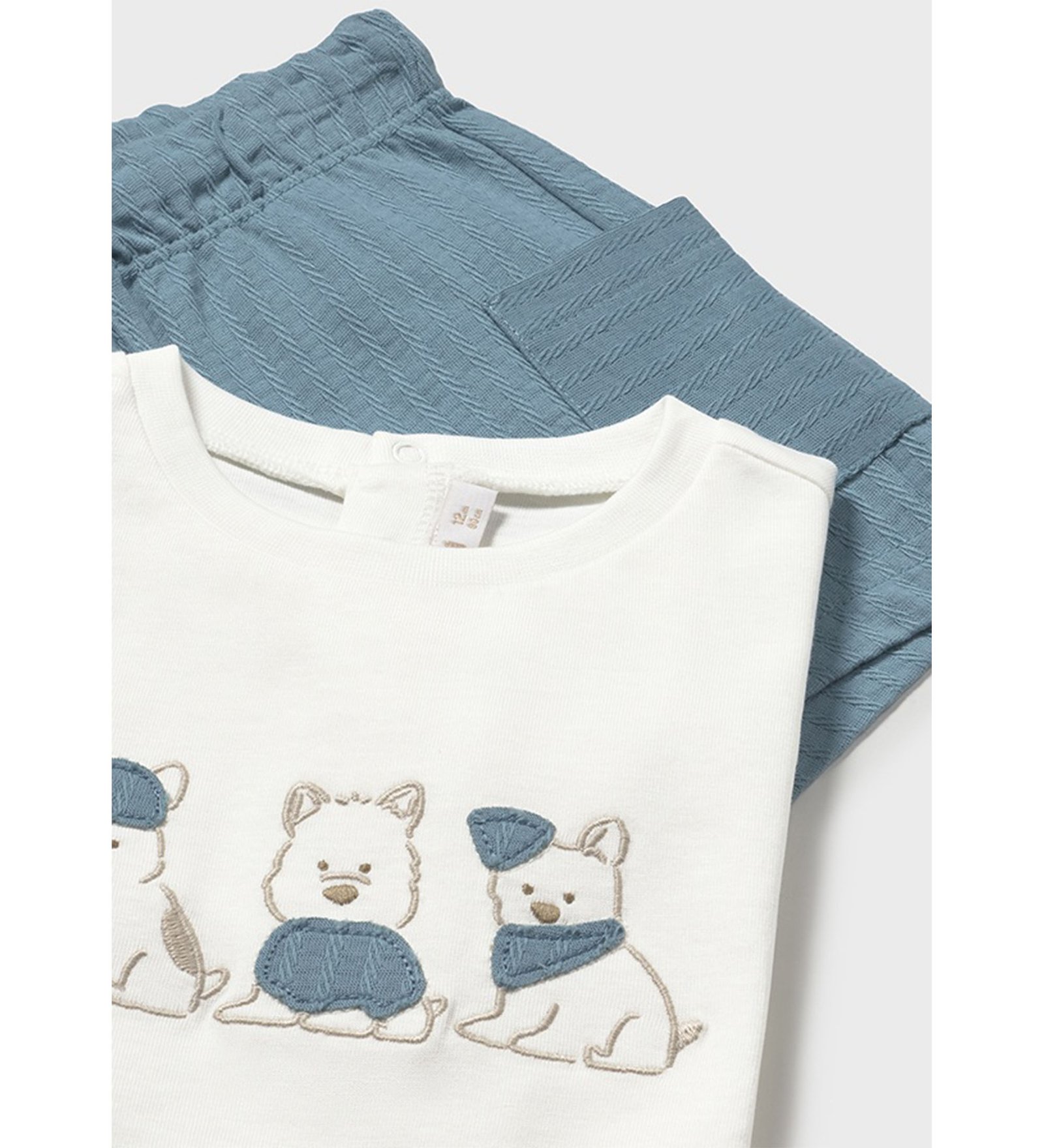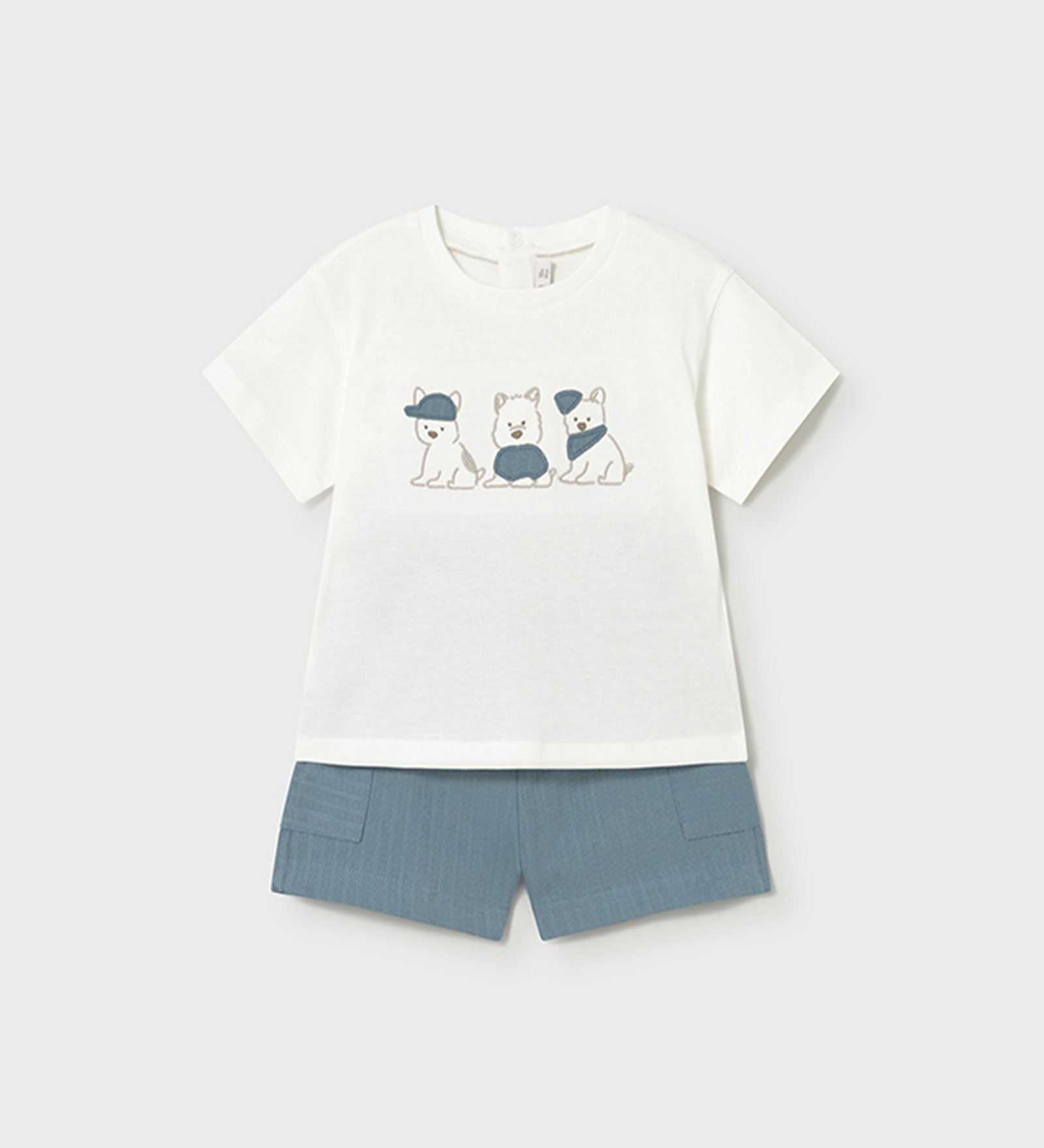 “Mayoral” Καλοκαιρινό βαμβακερό σετ μπλούζα με σορτσάκι για αγόρι, αποτελούμενο από λευκό t-shirt με σκυλάκια και σορτσάκι με λάστιχο στη μέση.
