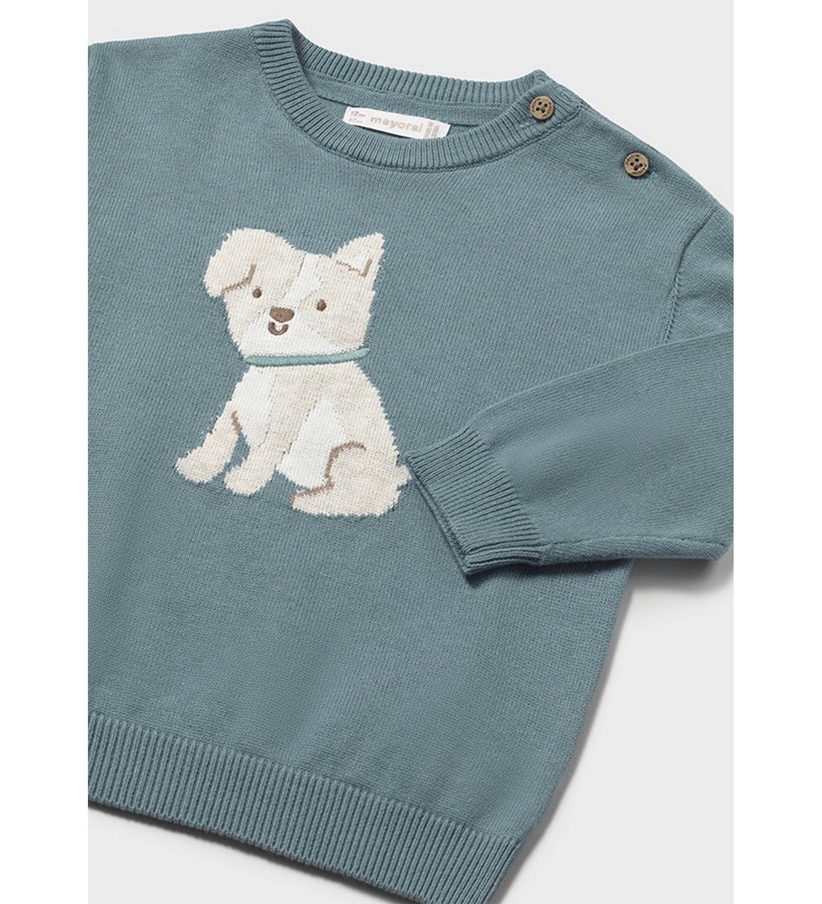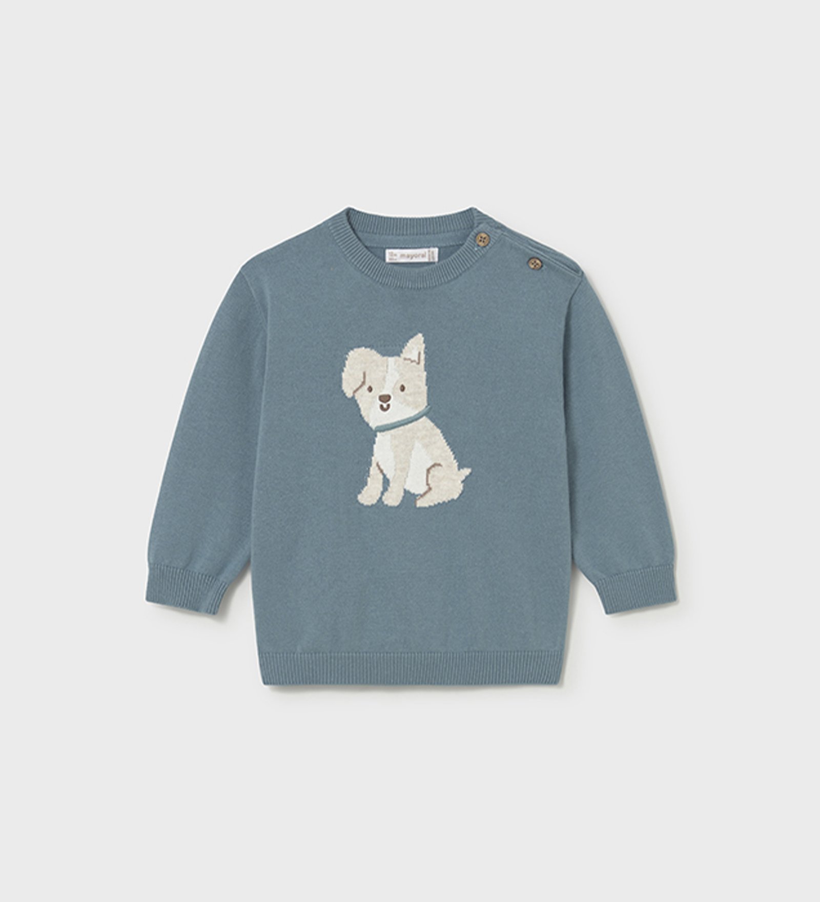 “Mayoral” Μακρυμάνικη βαμβακερή πλεκτή μπλούζα με σχέδιο σκυλάκι. Έχει πολύ απαλή υφή και διαθέτει κουμπάκια για εύκολη εφαρμογή.