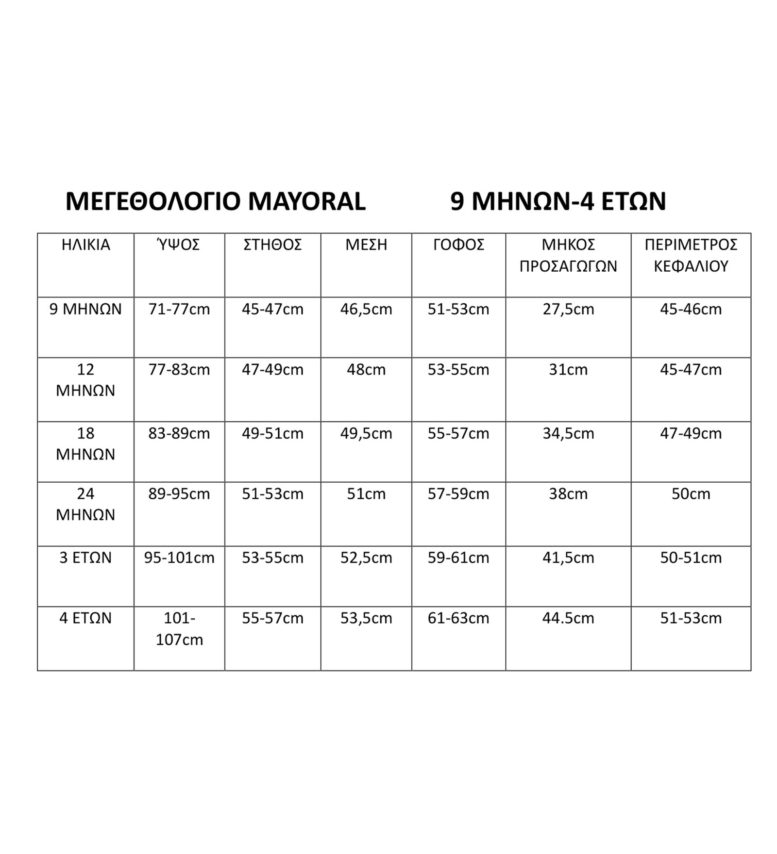 | Μέγεθος | 12-18 μηνών/80-86 εκ., 18-24 μηνών/86-92 εκ., 2 ετών, 3 ετών, 4 ετών, 9-12 μηνών/74-80 εκ. |