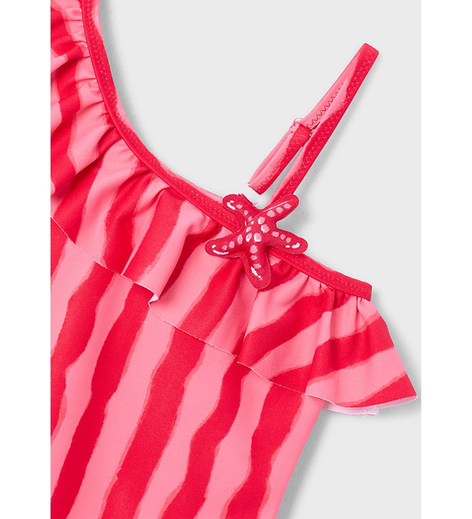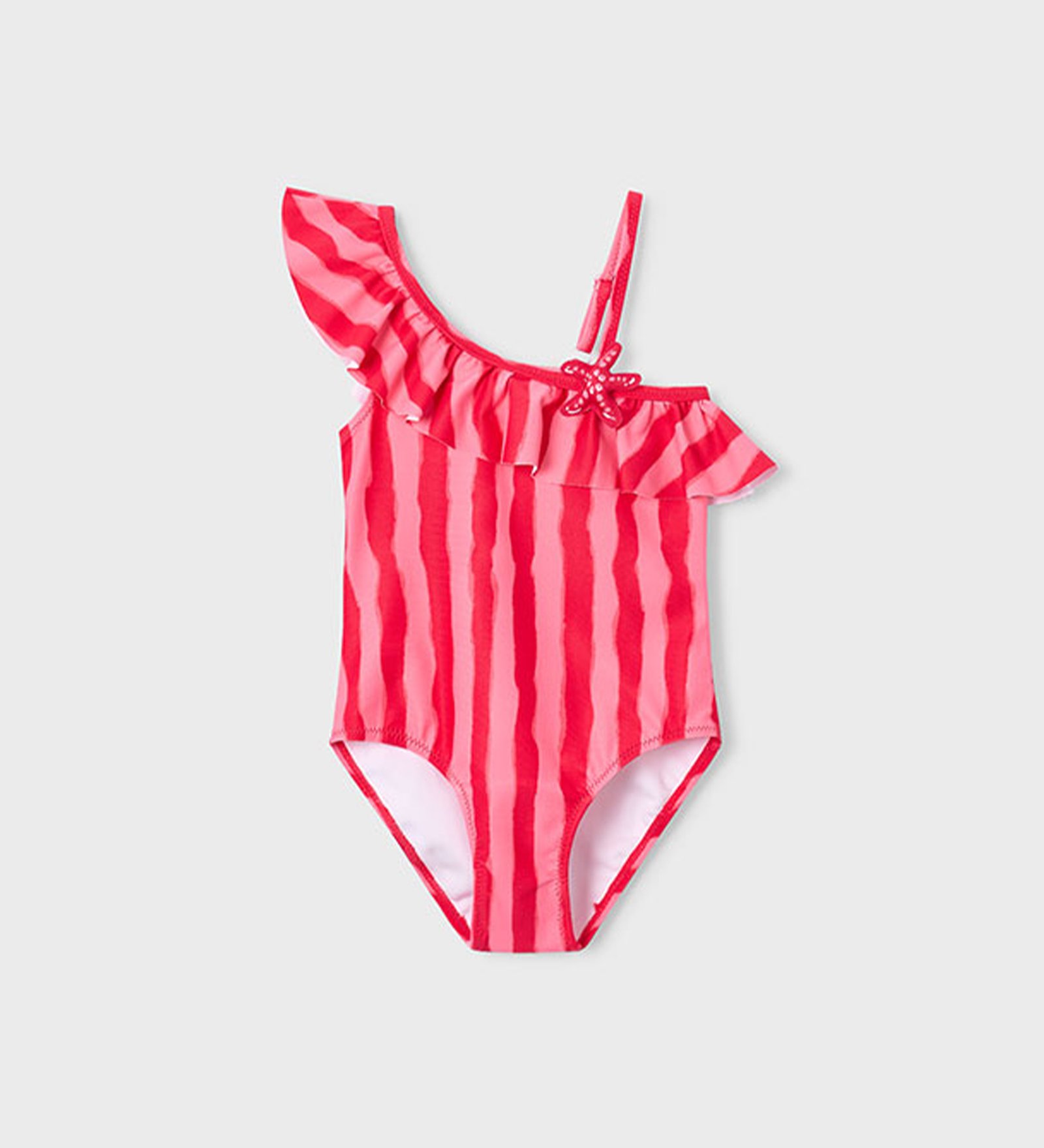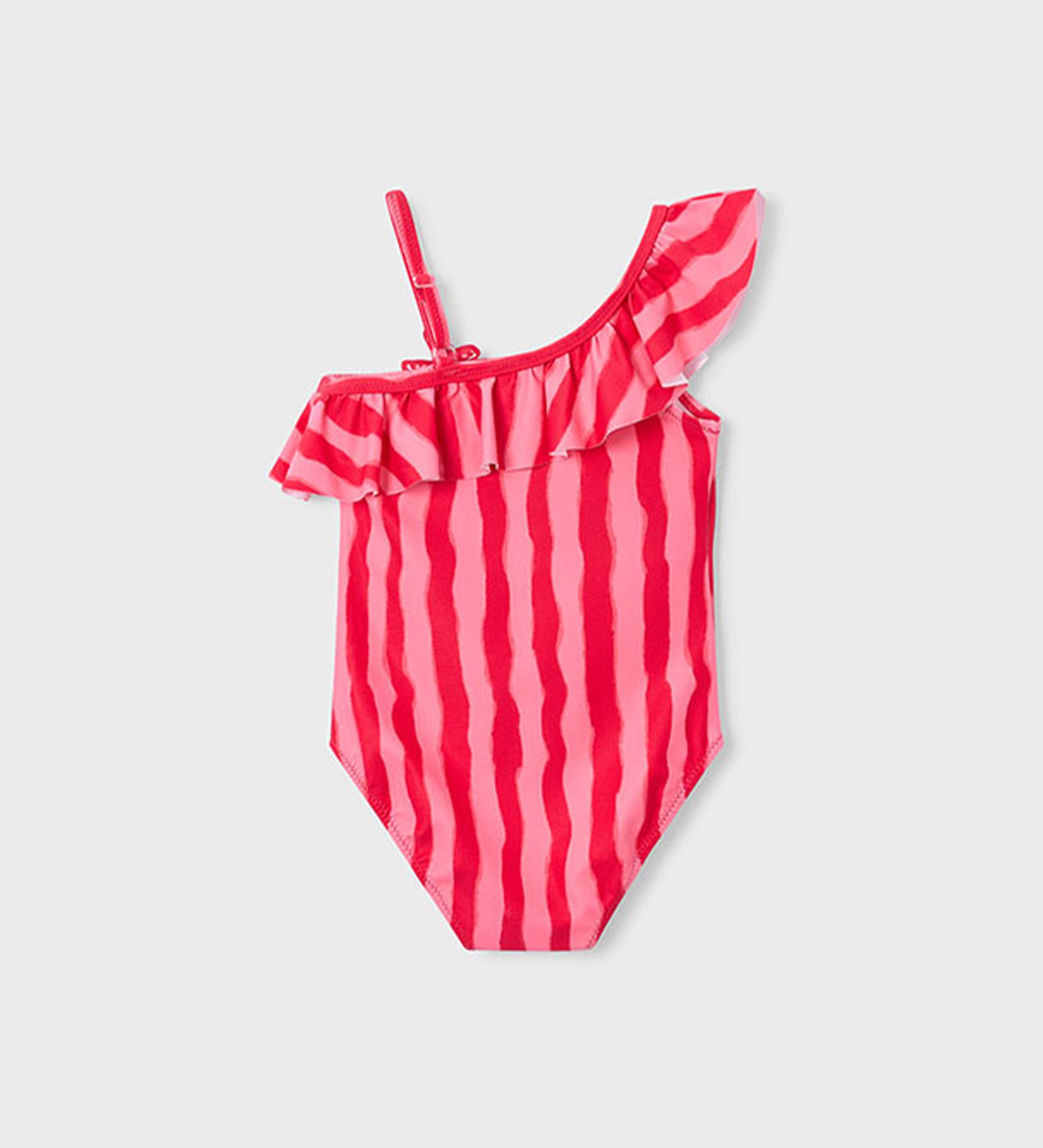 “Mayoral” Παιδικό ολόσωμο μαγιό σε κόκκινη απόχρωση με πολύχρωμο σχέδιο. Διαθέτει φαρδιές τιράντες και διακριτικό βολάν στο επάνω μέρος.