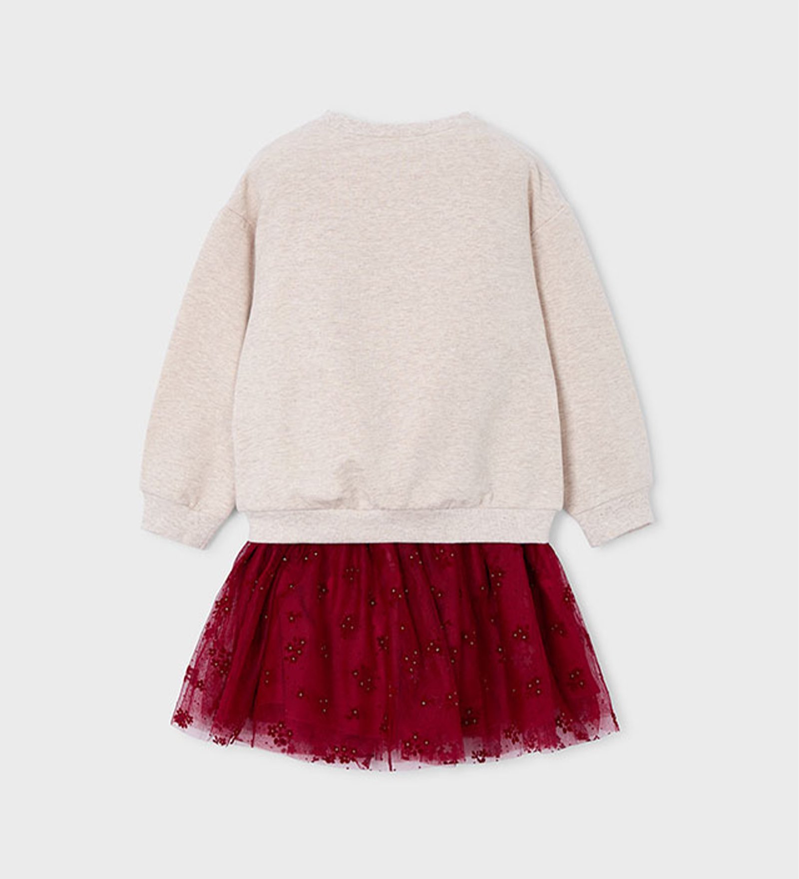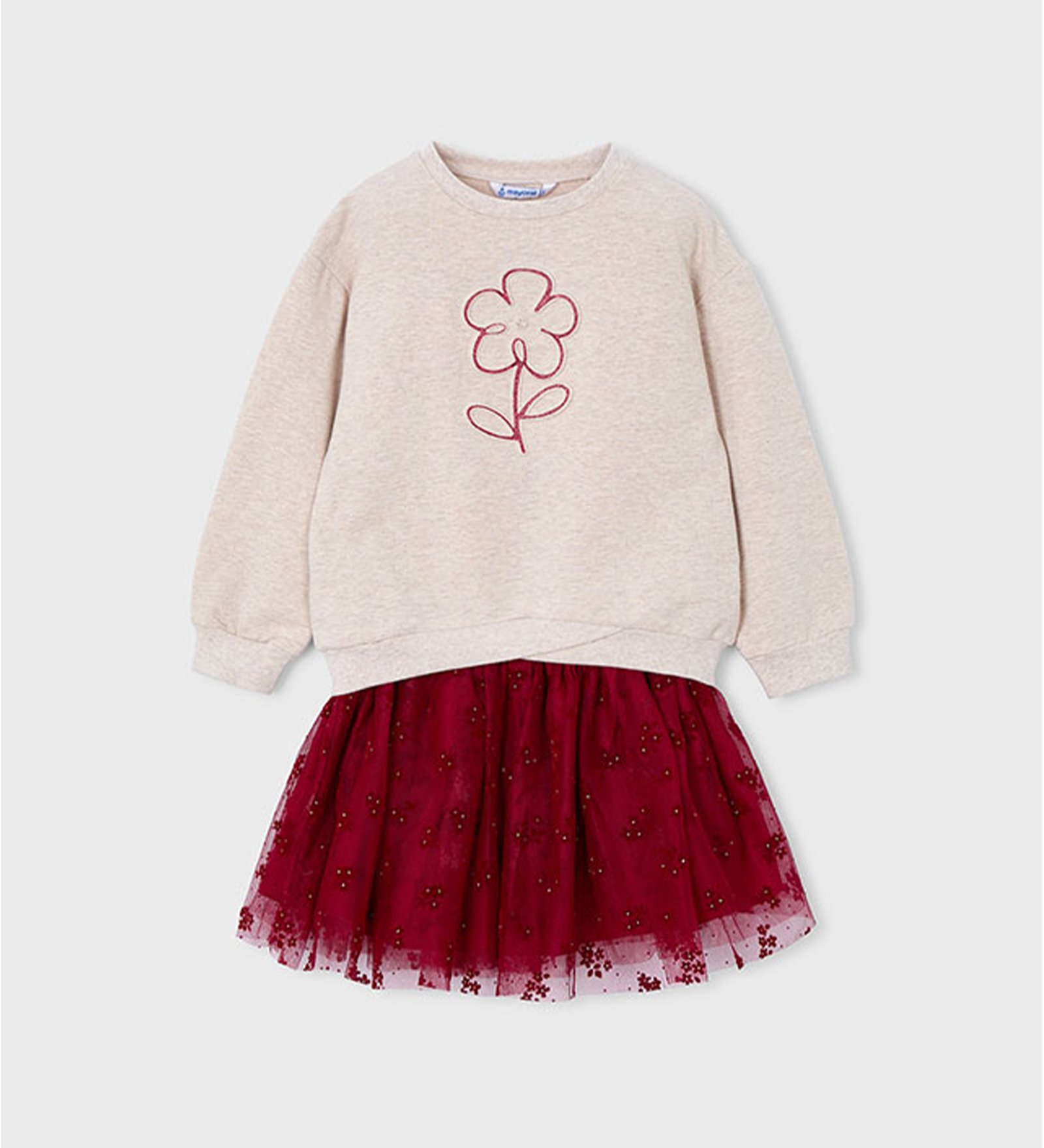 “Mayoral” Χειμερινό σετ εκρού φούτερ με σχέδιο λουλούδι και κόκκινη τουτού με τούλι και print βελούδινα λουλουδάκια με glitter.