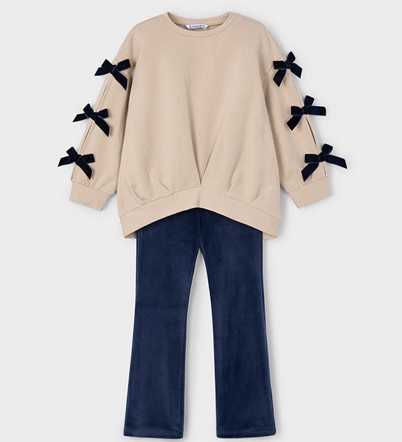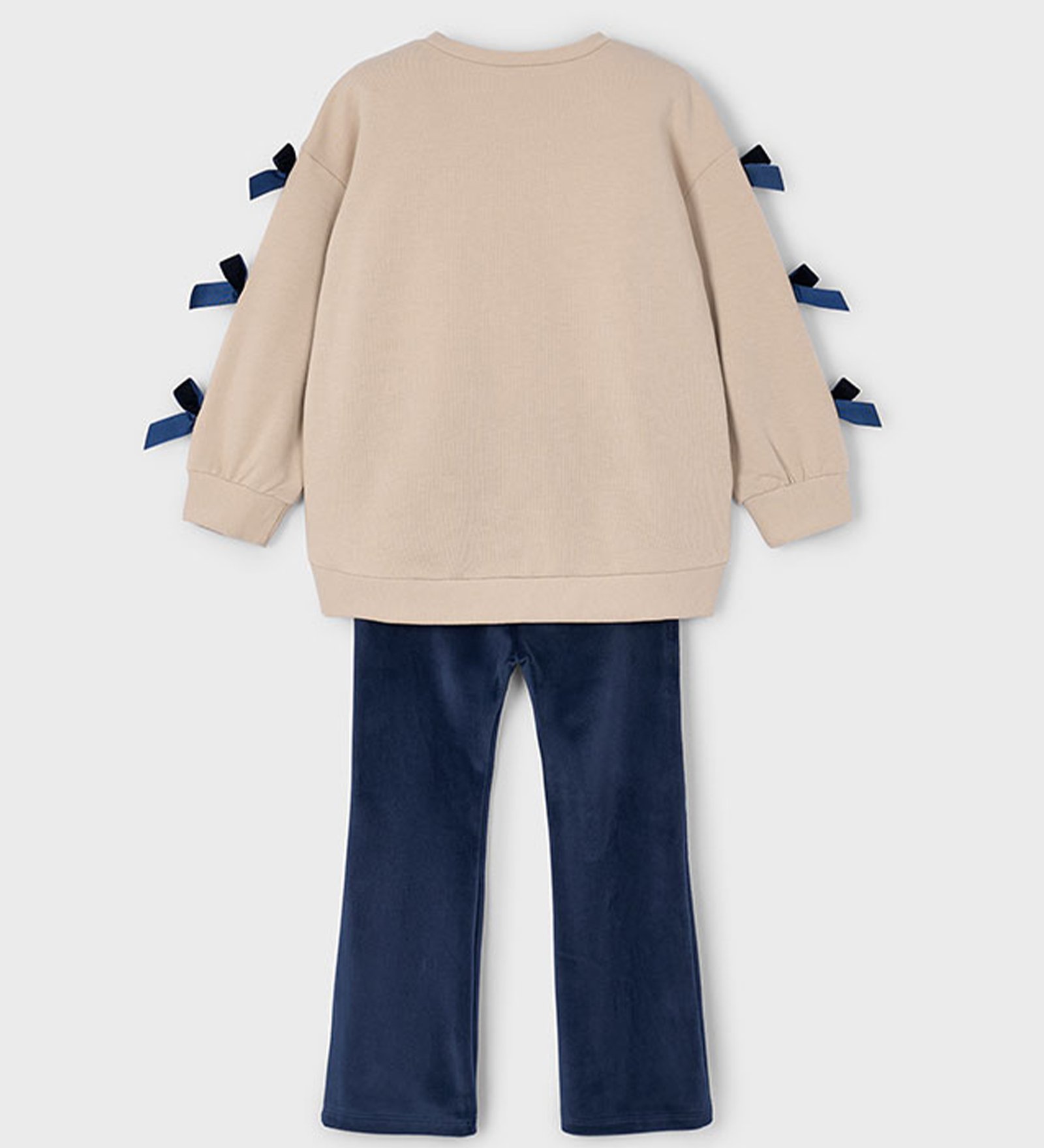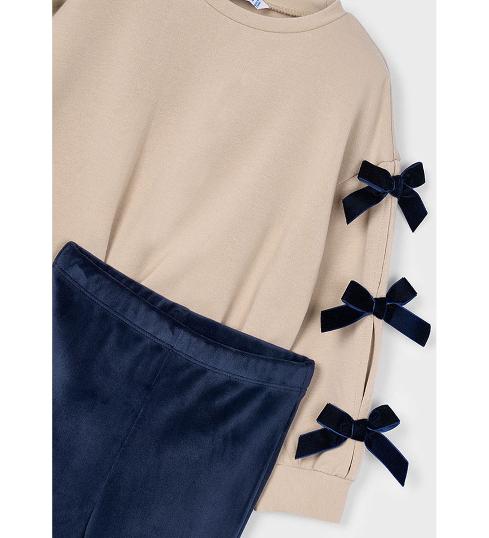“Mayoral” Σετ φούτερ με κολάν. Το φούτερ είναι σε μπεζ απόχρωση με μπλε βελούδινους φιόγκους στο πλάι και κολάν μπλε βελούδινο.