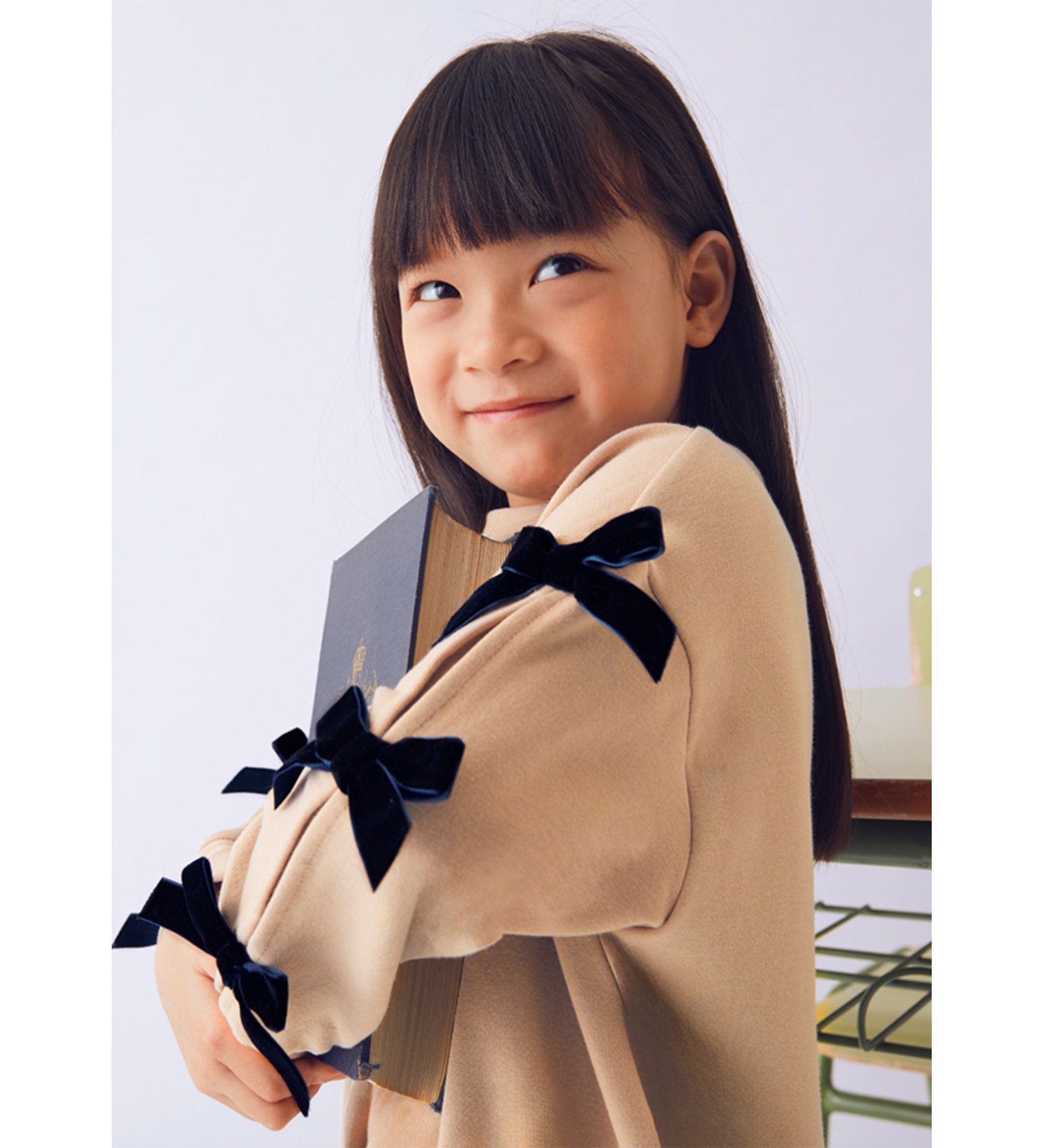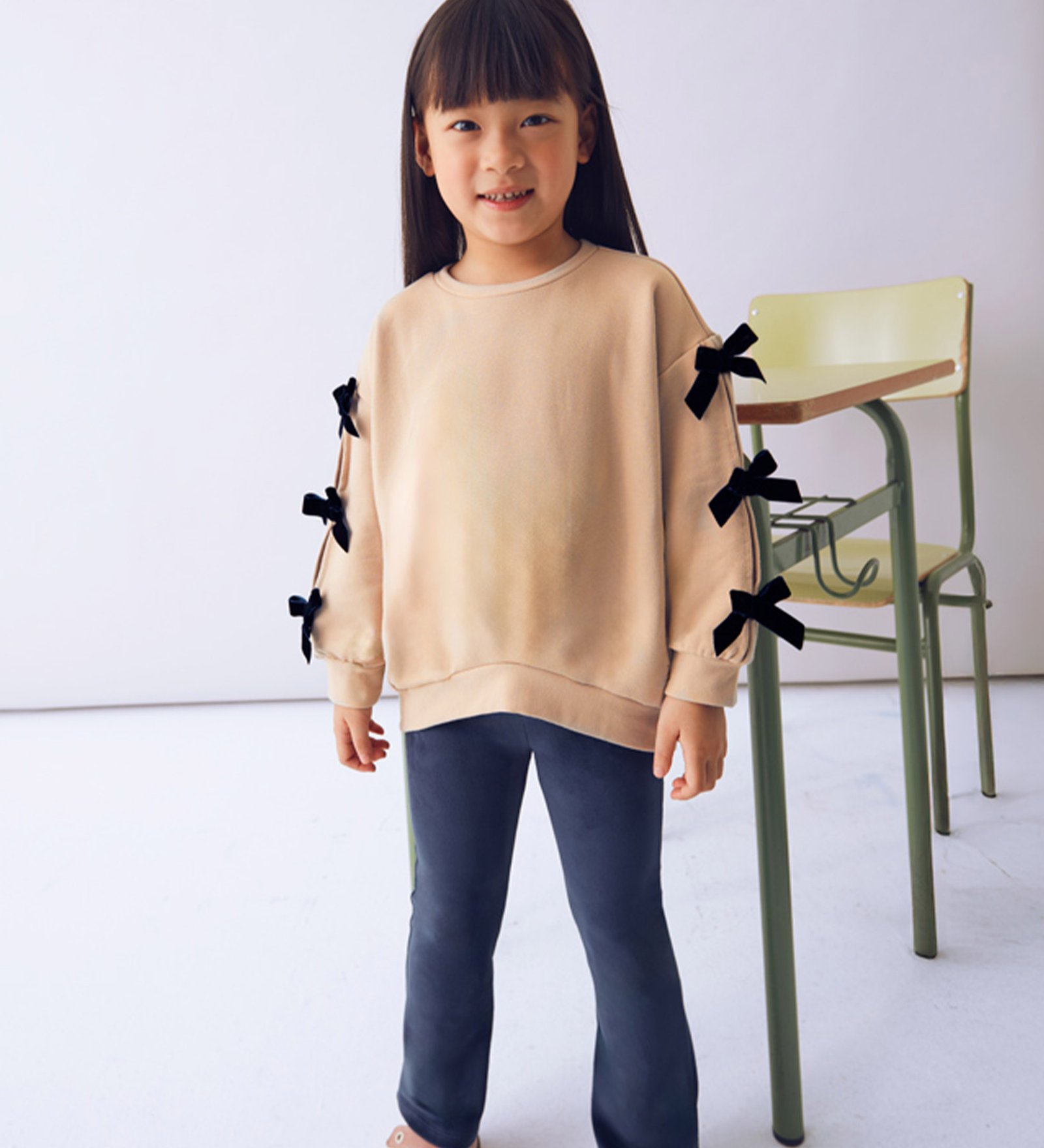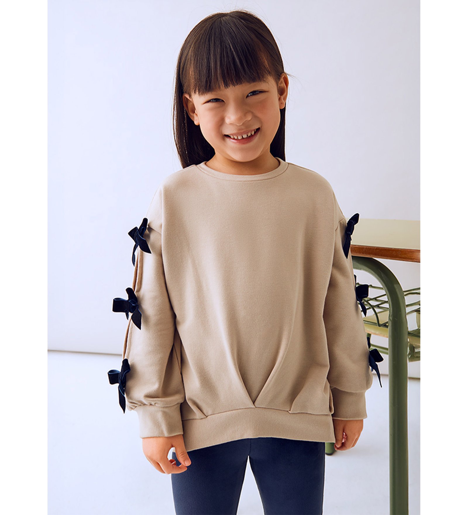 “Mayoral” Σετ φούτερ με κολάν. Το φούτερ είναι σε μπεζ απόχρωση με μπλε βελούδινους φιόγκους στο πλάι και κολάν μπλε βελούδινο.