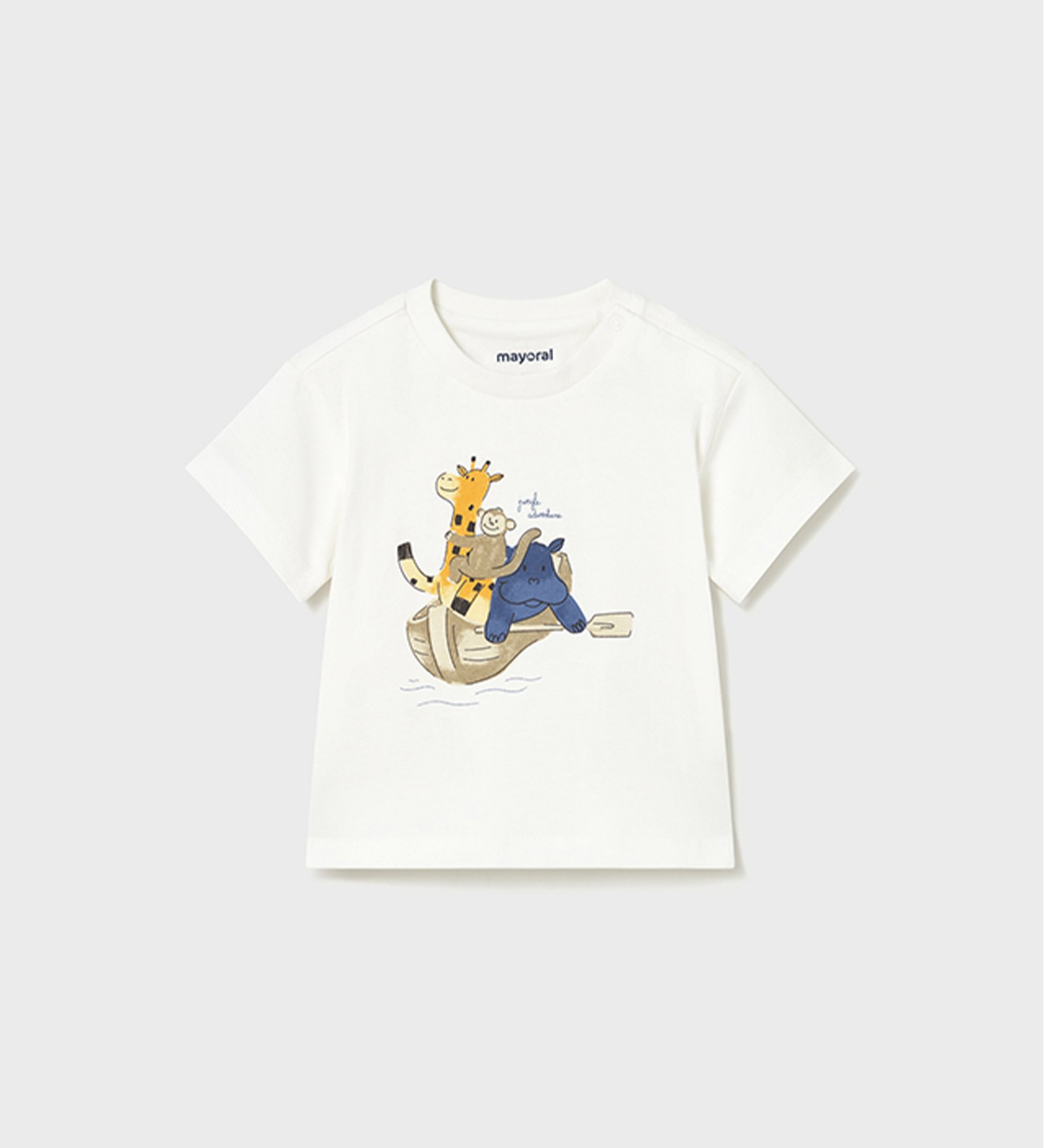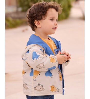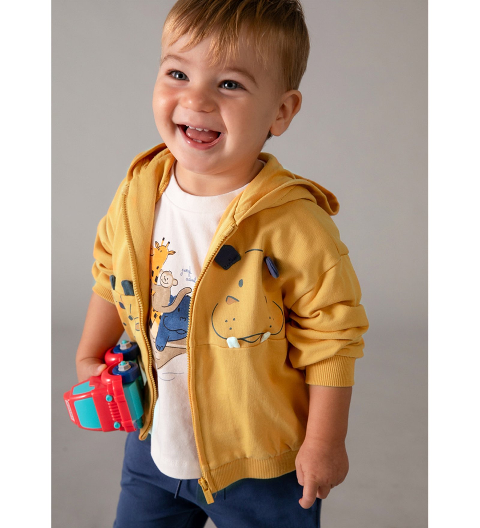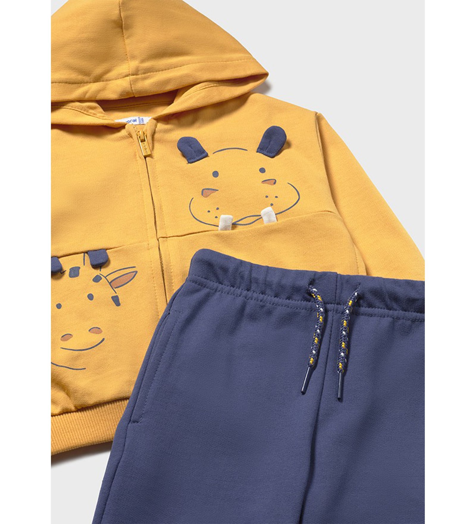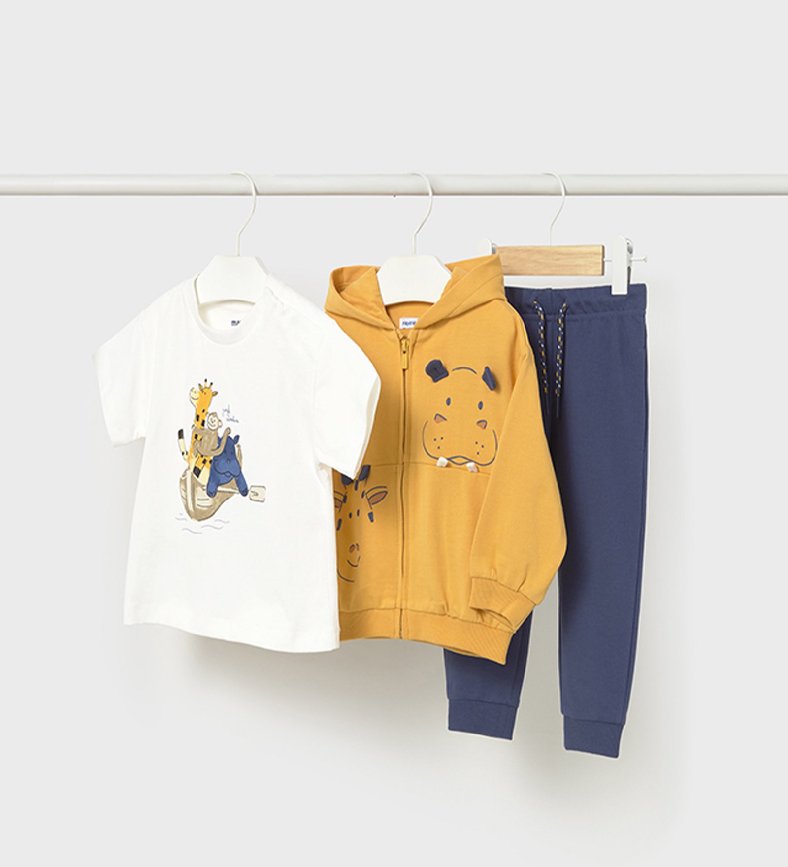 “Mayoral” Ανοιξιάτικο σετ τριών τεμαχίων αποτελούμενο από ζακέτα με κουκούλα, κοντομάνικο μπλουζάκι και φόρμα παντελόνι με σχέδιο ιπποπόταμο.