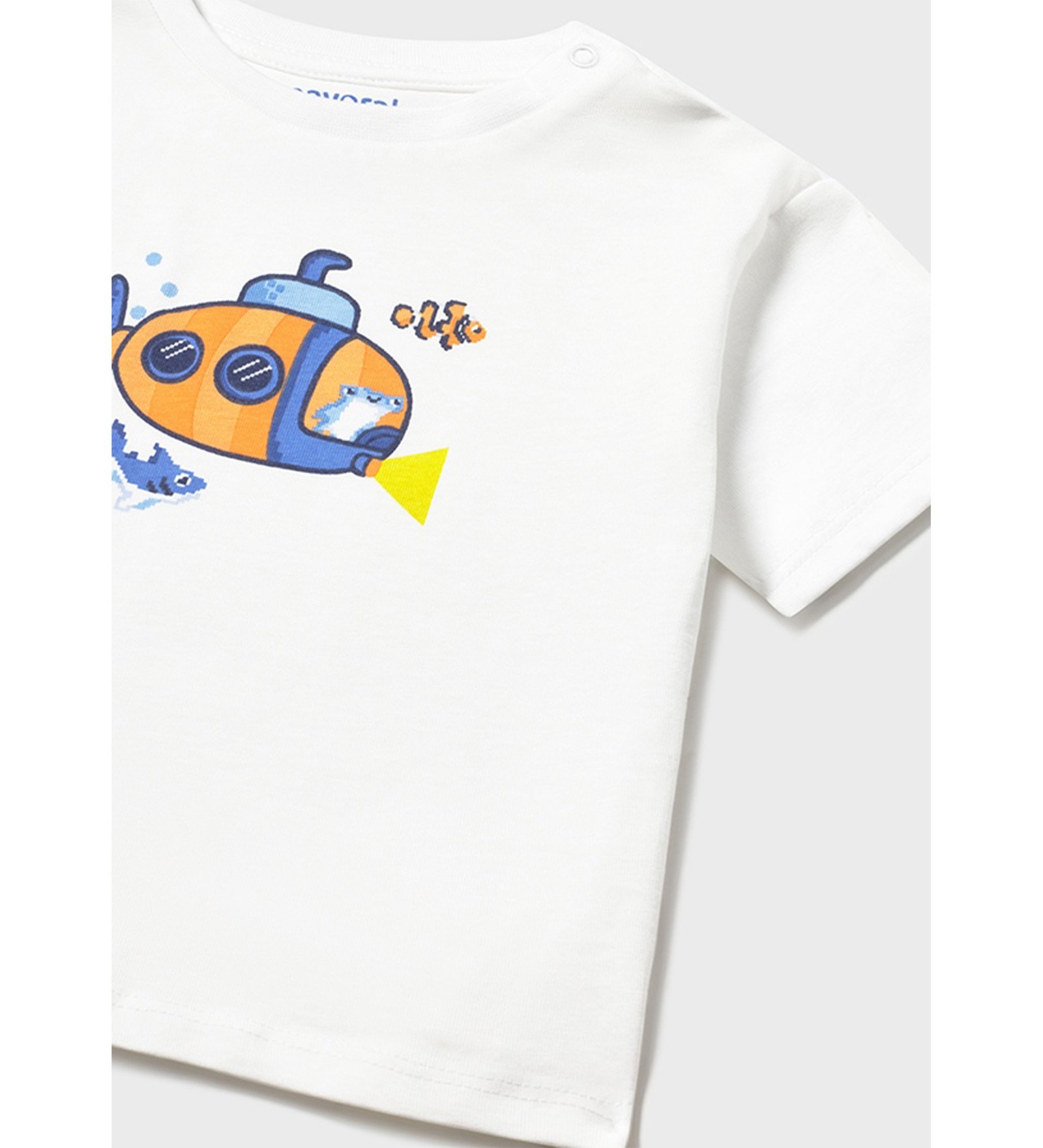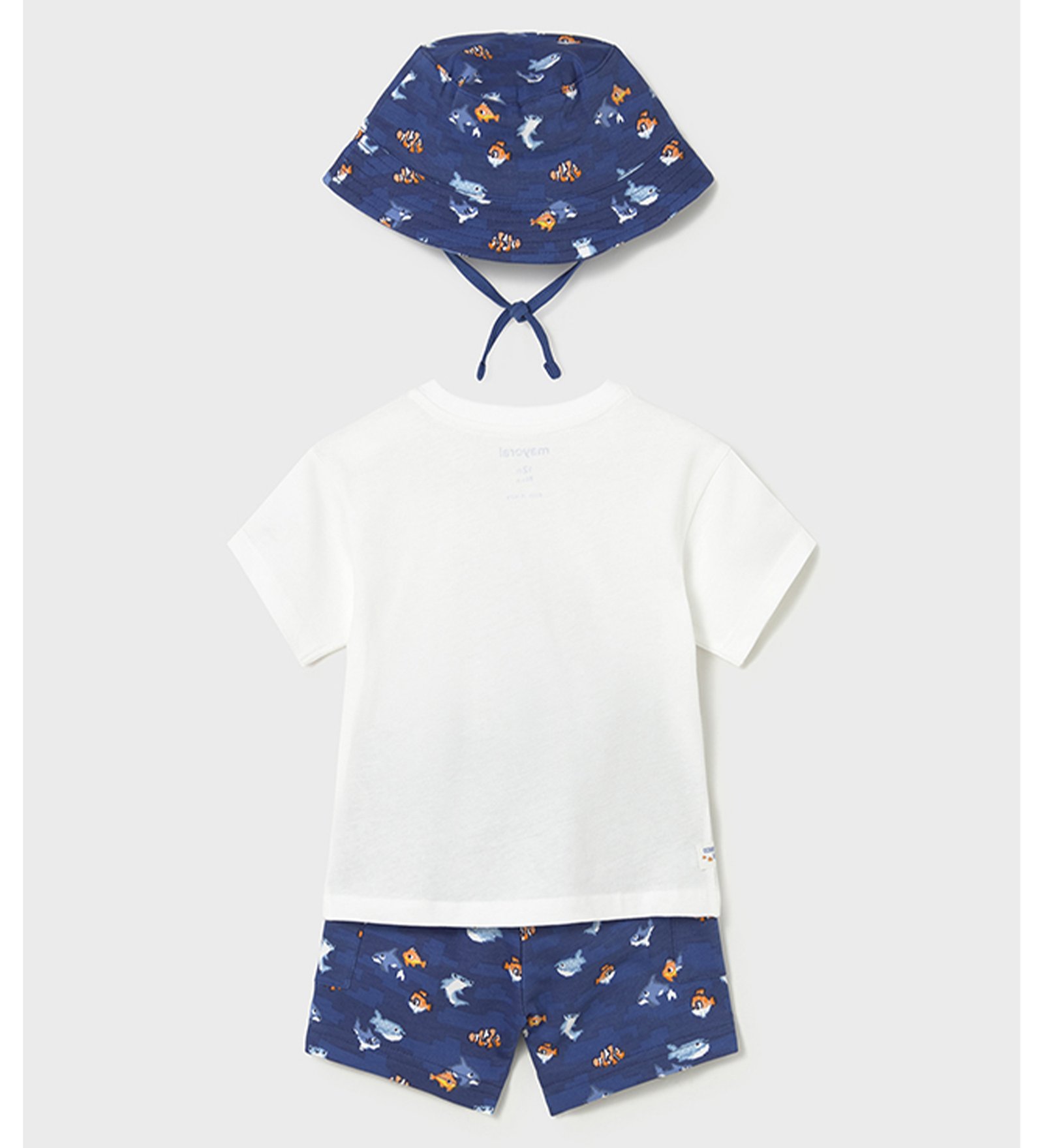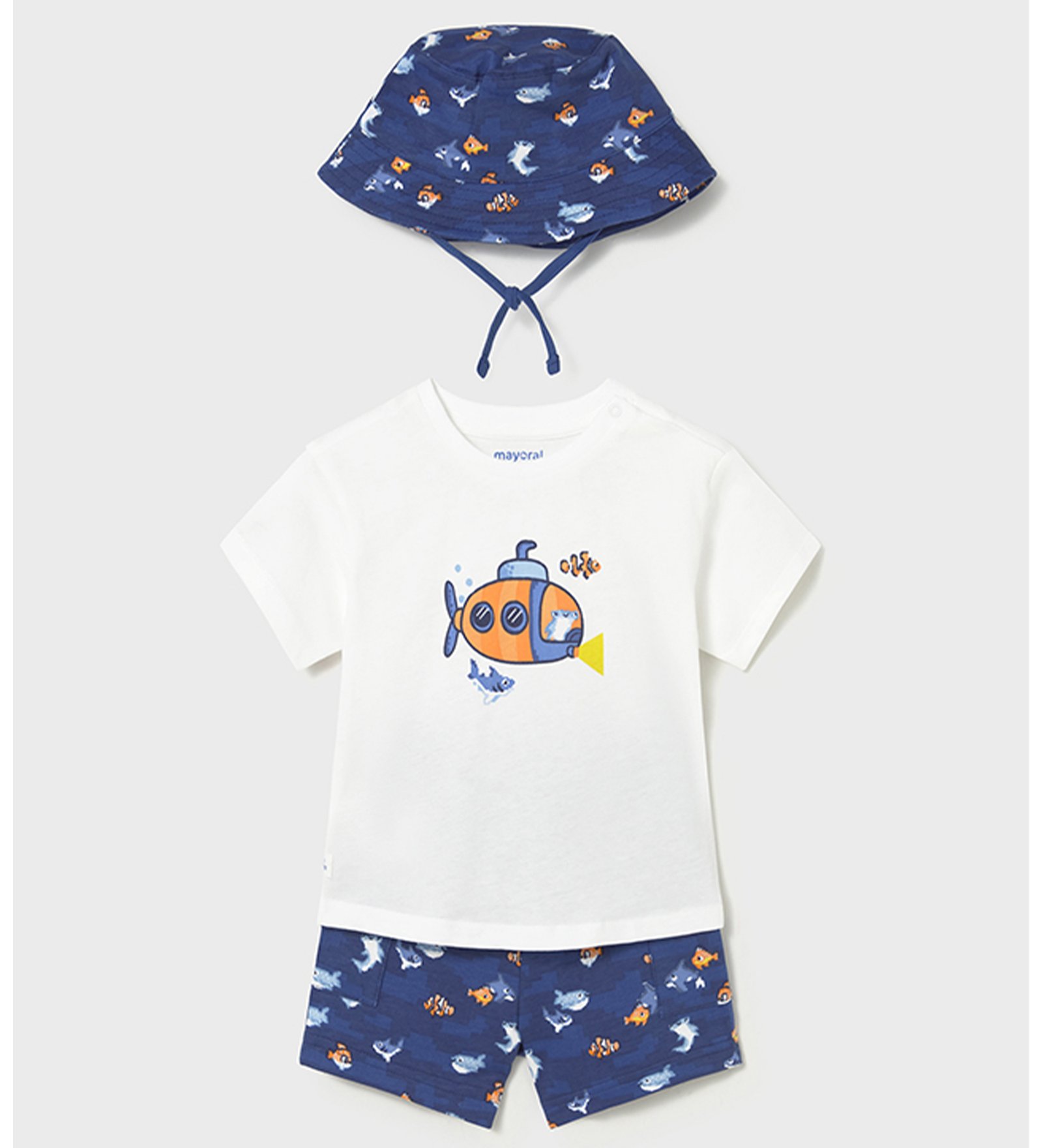 “Mayoral” Καλοκαιρινό σετ τριών τεμαχίων αποτελούμενο από λευκό t-shirt με σχέδιο υποβρύχιο, μπλε σορτσάκι με λάστιχο στη μέση και καπέλο.