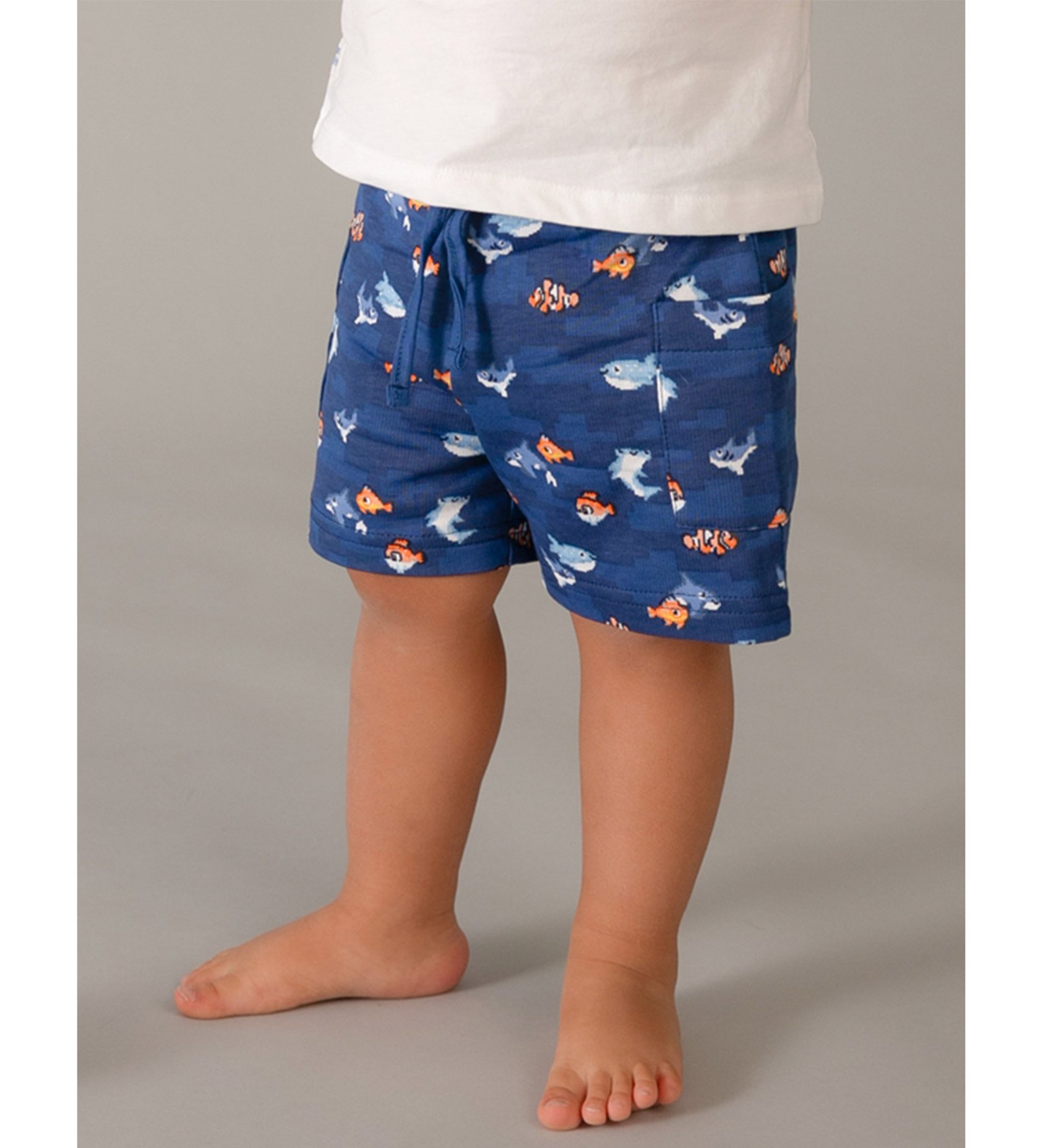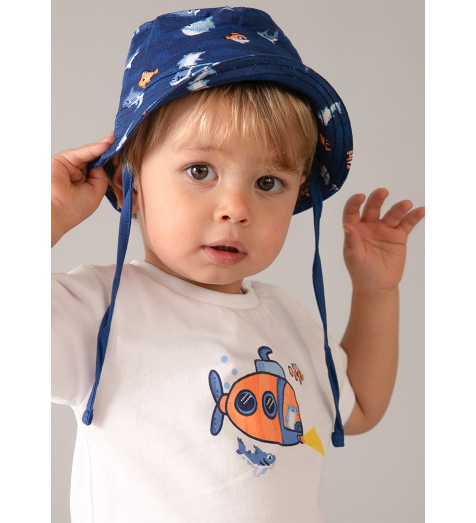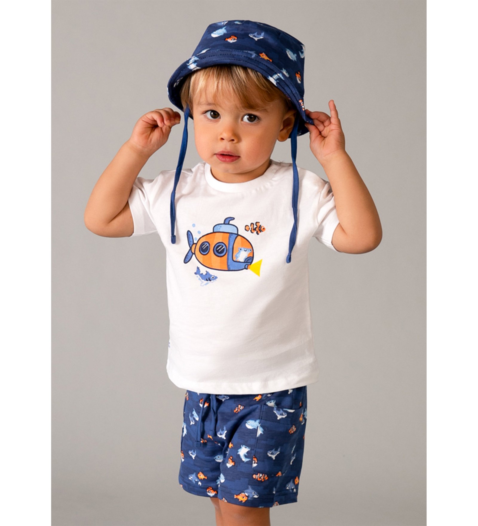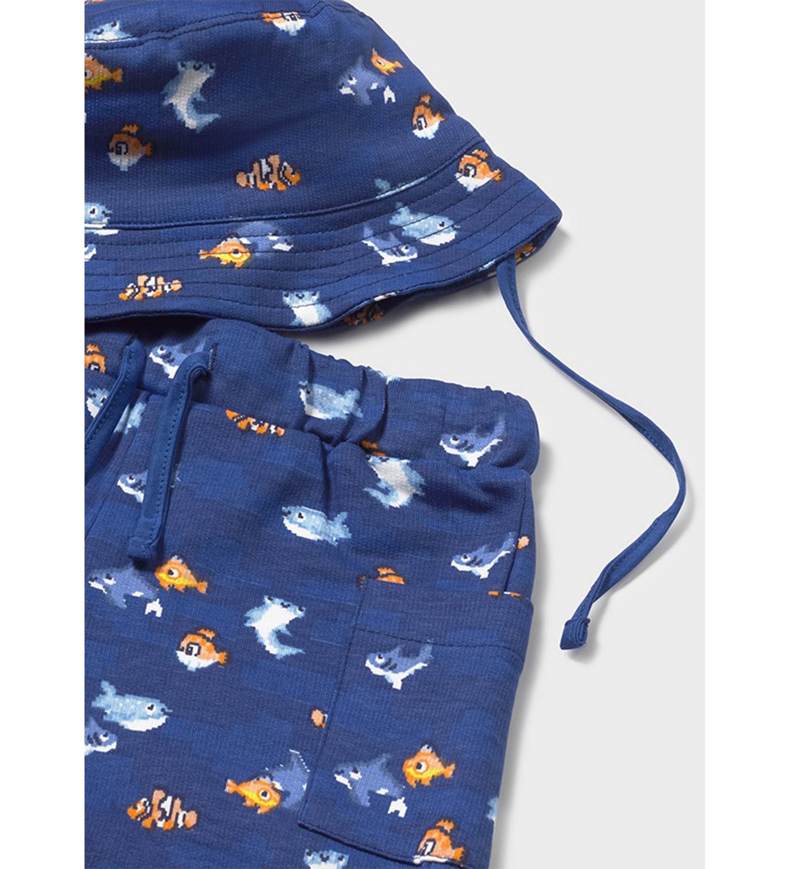 “Mayoral” Καλοκαιρινό σετ τριών τεμαχίων αποτελούμενο από λευκό t-shirt με σχέδιο υποβρύχιο, μπλε σορτσάκι με λάστιχο στη μέση και καπέλο.