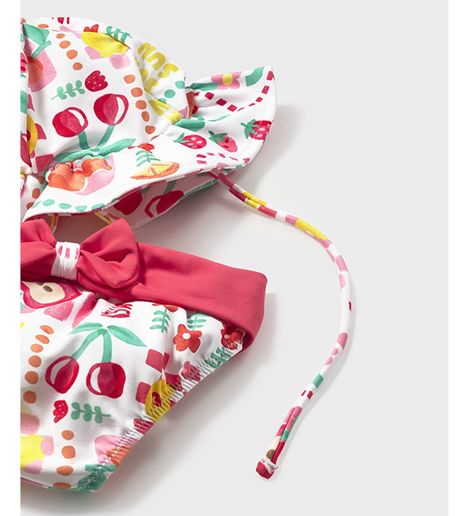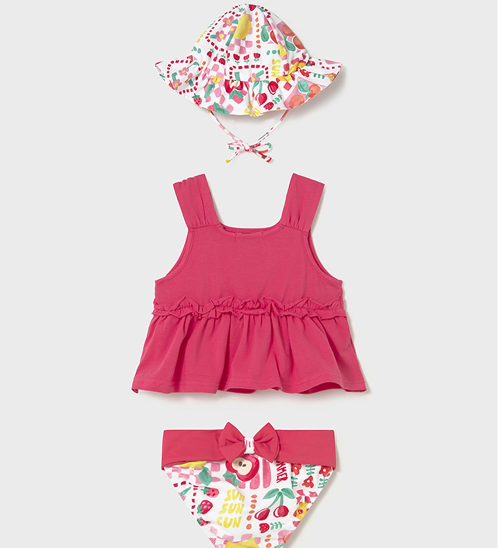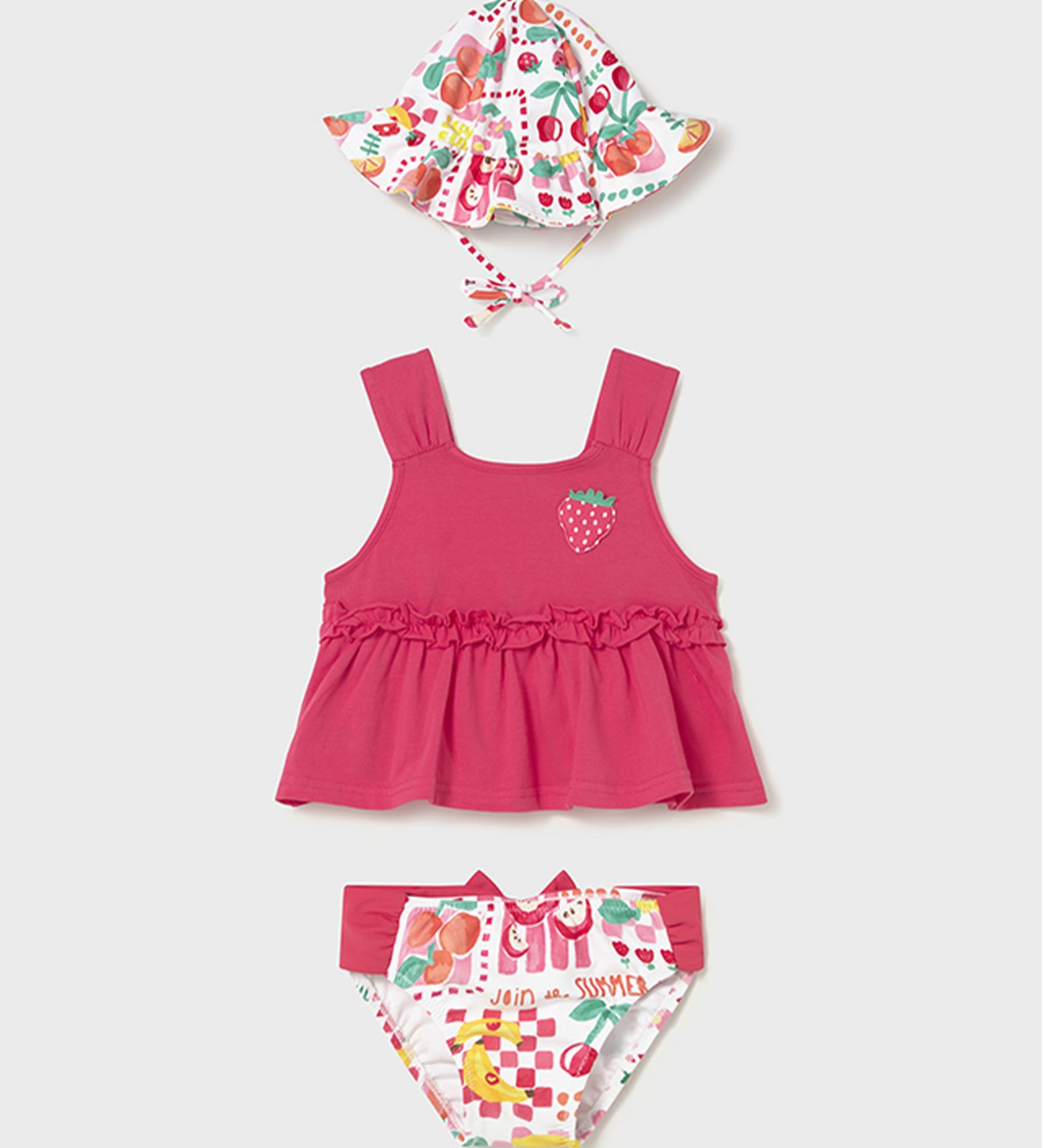 Παιδικό σετ μπικίνι σε ζωηρή ροζ απόχρωση με φρουτένιο καλοκαιρινό print. Περιλαμβάνει τοπ με τιράντες και βολάν στη μέση, σλιπ με πολύχρωμο σχέδιο και ασορτί καπελάκι για ολοκληρωμένο, χαρούμενο look στην παραλία.