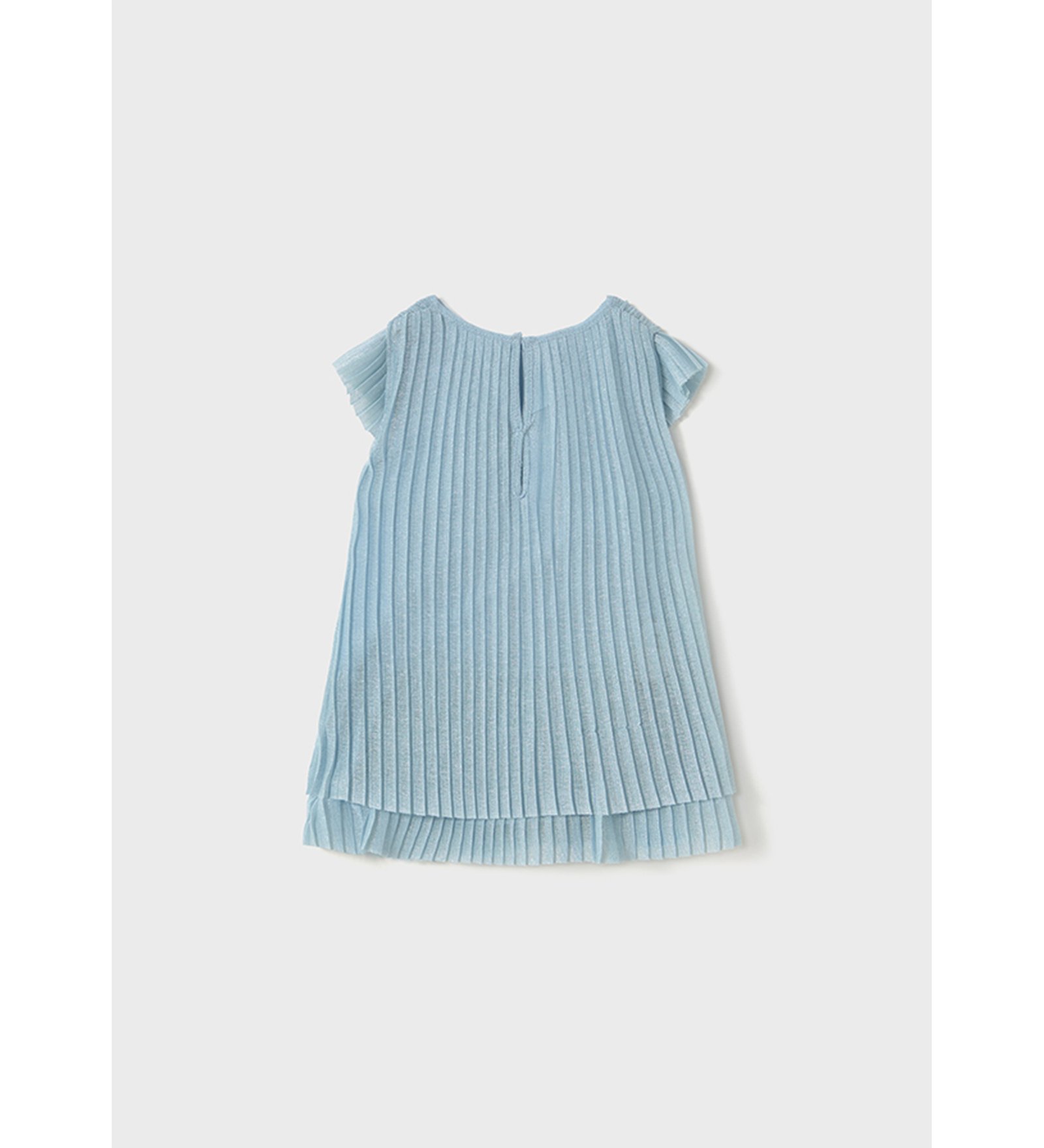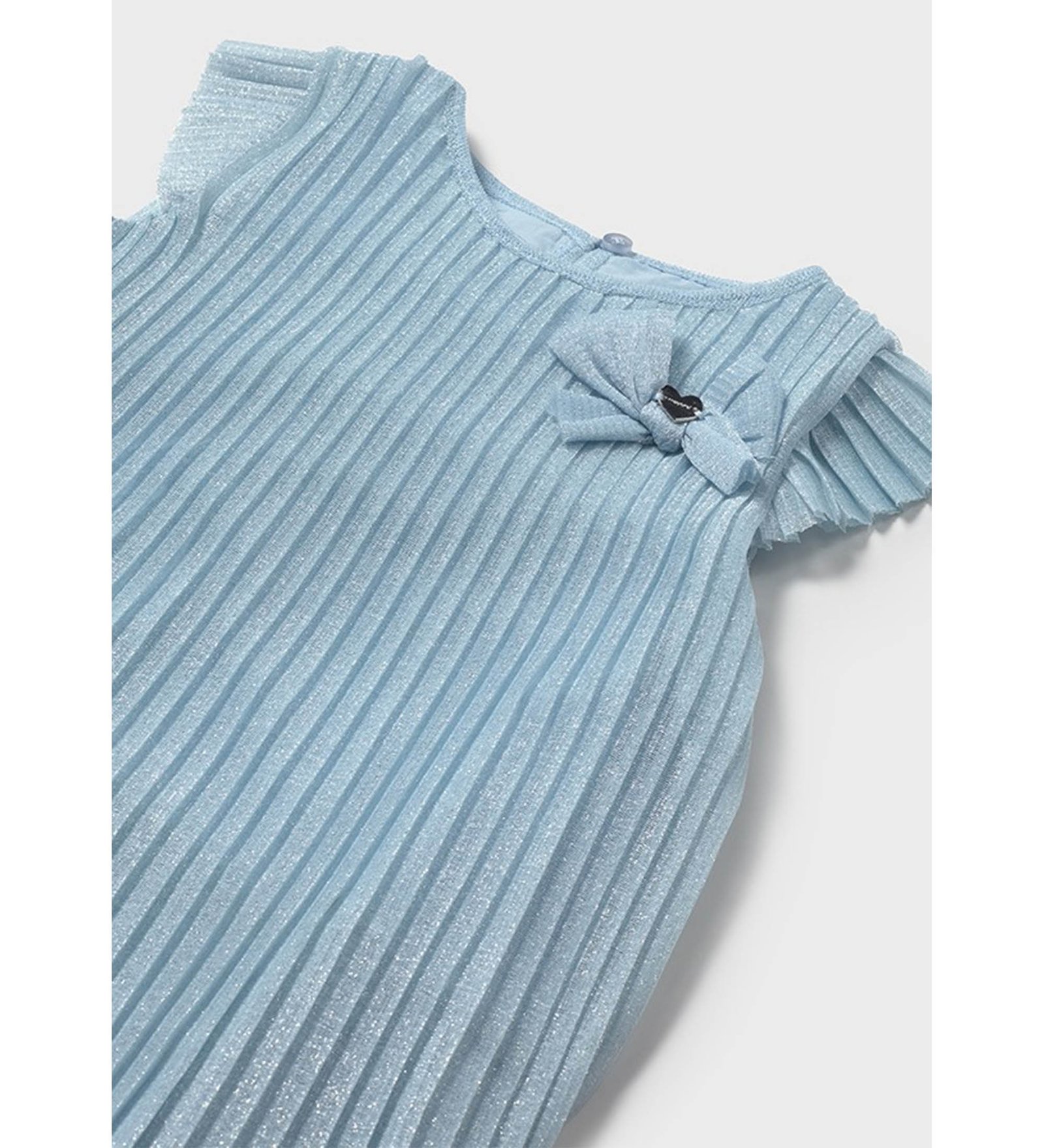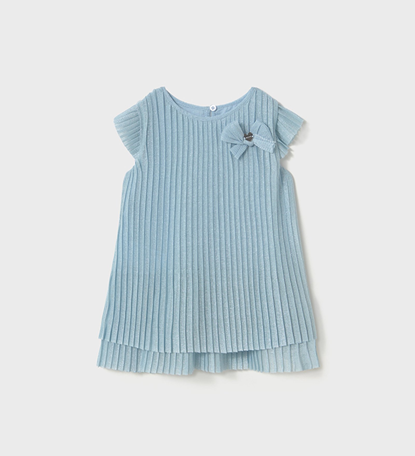“Mayoral” Πλισέ βρεφικό φόρεμα για κορίτσι σε απόχρωση ciel. Το φόρεμα είναι σε γραμμή Α και διαθέτει φιόγκιο στο μπροστά μέρος.