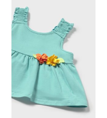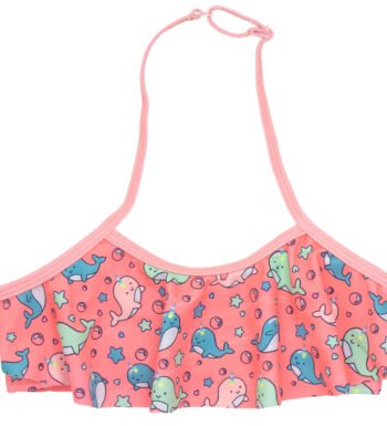 Μπλε μαγιό με ροζ βολάν στην πλάτη.