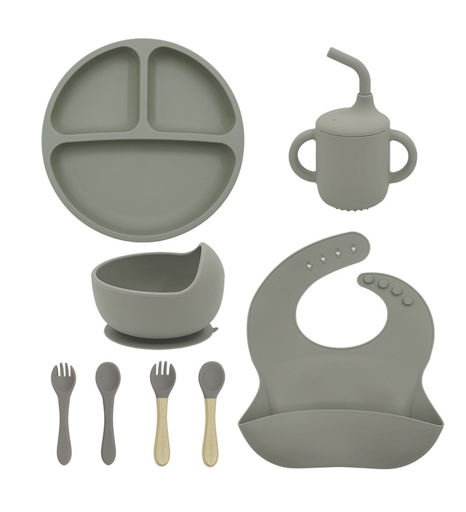 Σετ φαγητού από σιλικόνη σε χακί χρώμα, που περιλαμβάνει παγούρι, σαλιάρα, μπολ και πιάτο με τρεις θέσεις με βεντούζα στη βάση, 2 κουτάλια και 2 πιρούνια.