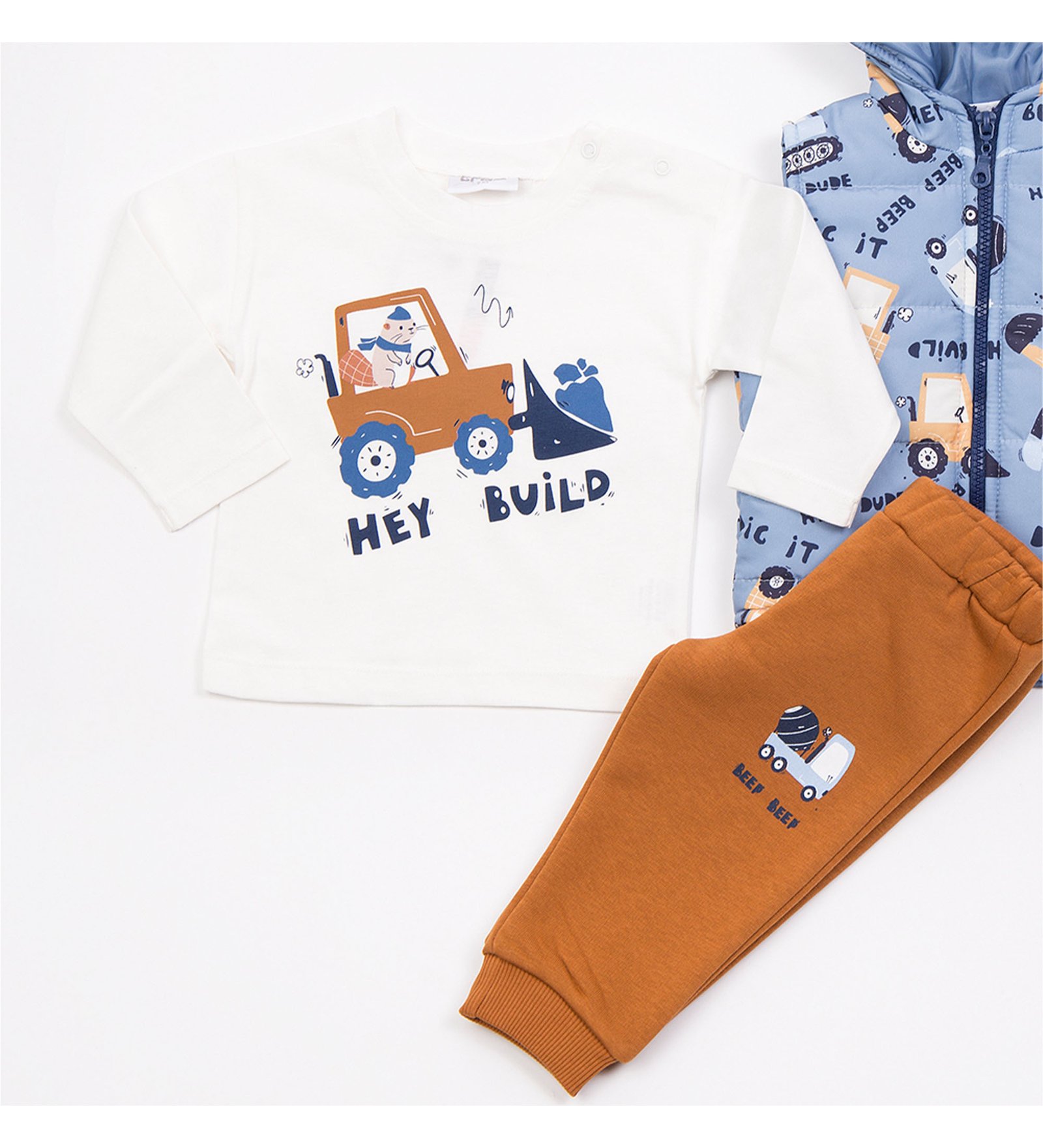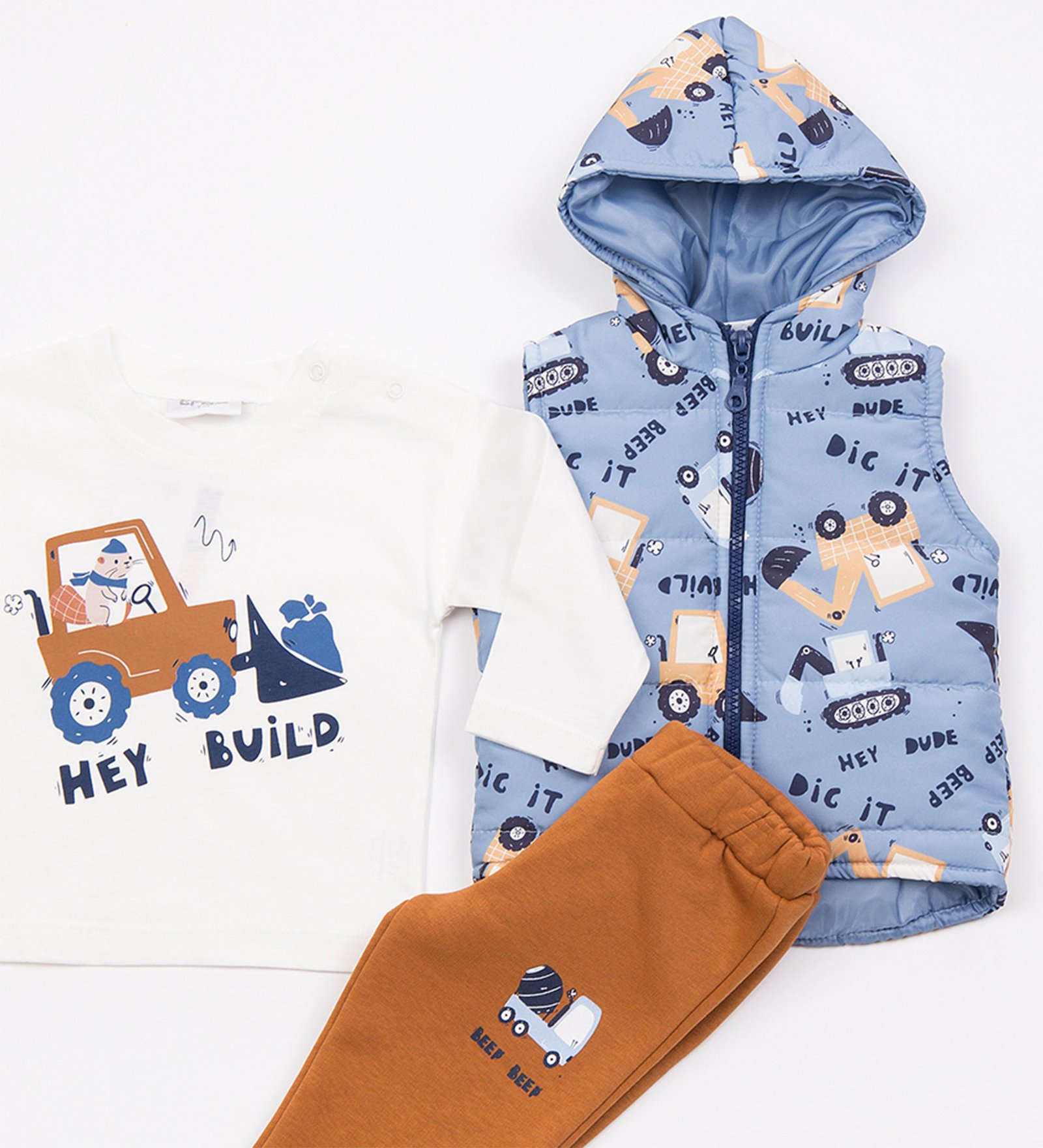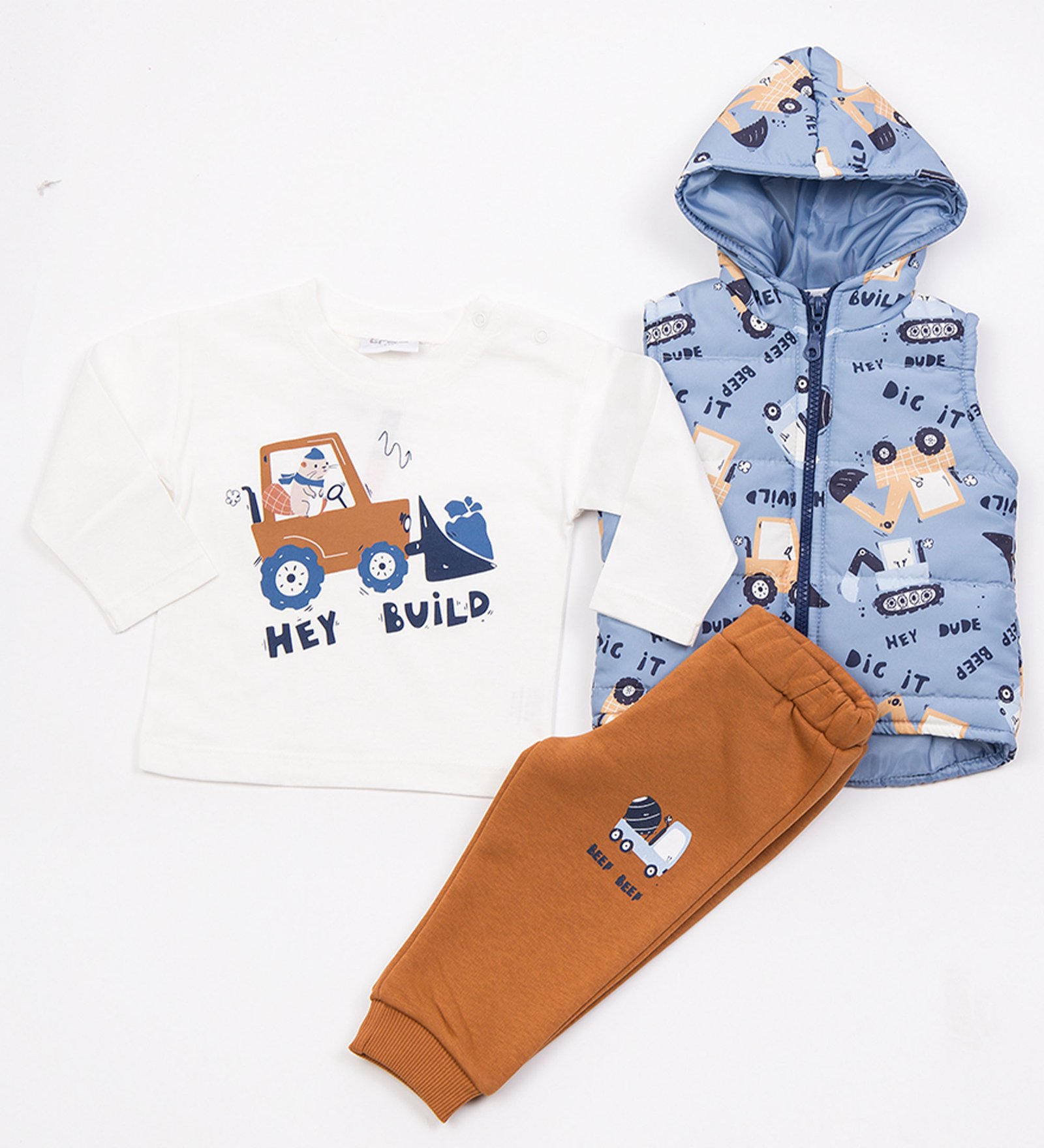 Βρεφικό σετ 3 τεμαχίων για αγόρι της εταιρείας Trax. Το σετ αποτελείται από αμάνικο μπουφάν με κουκούλα, μακρυμάνικο μπλουζάκι και παντελόνι φόρμα.