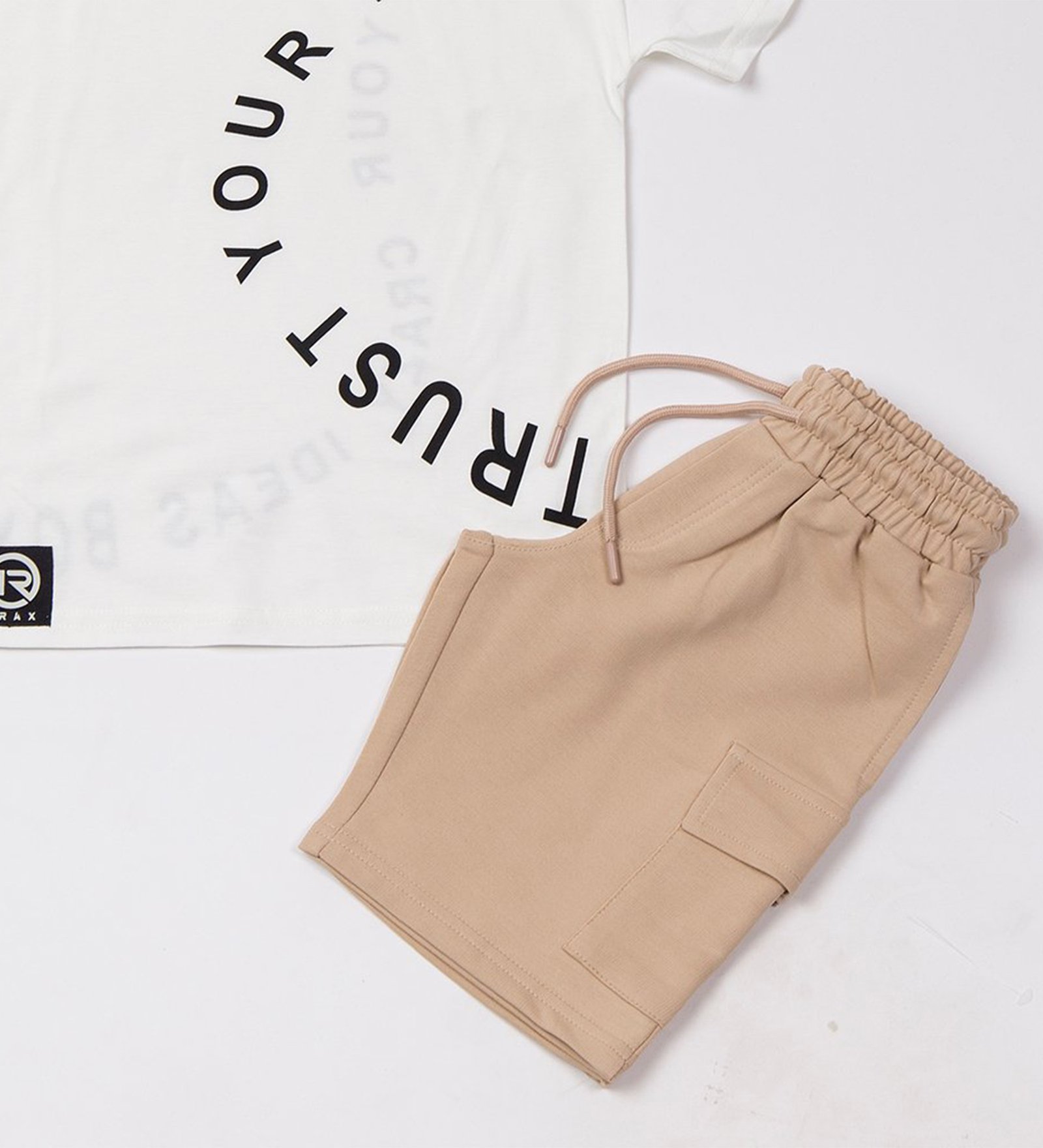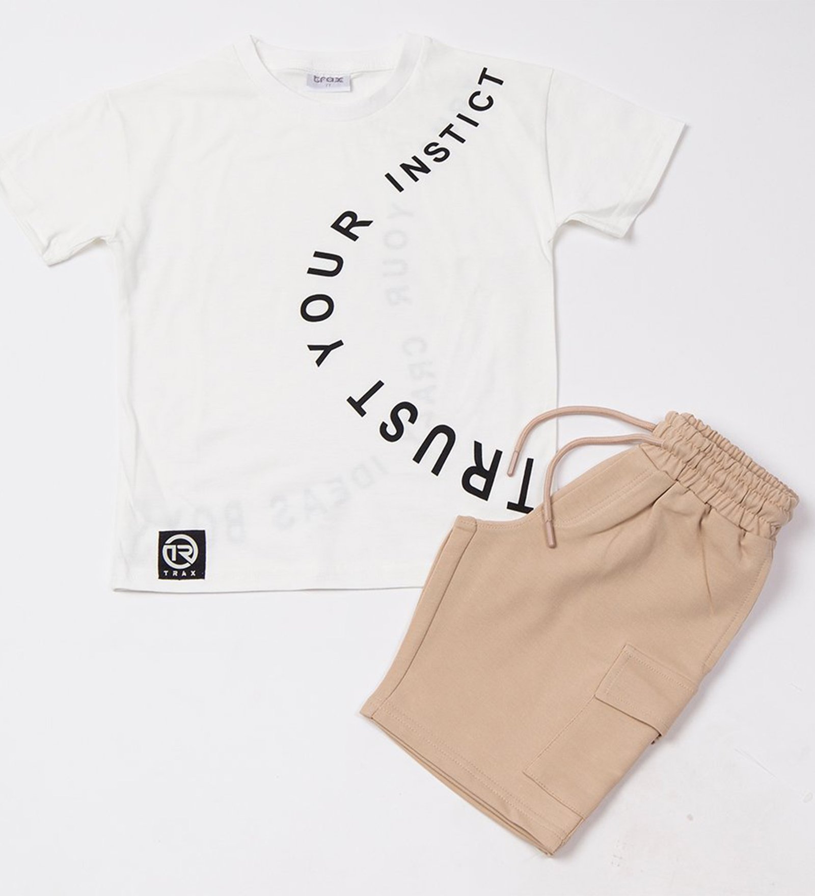 Παιδικό σετ με λευκή κοντομάνικη μπλούζα με μοντέρνο τύπωμα και μπεζ σορτσάκι με λάστιχο και τσέπες, ιδανικό για άνετες και στυλάτες καθημερινές εμφανίσεις.