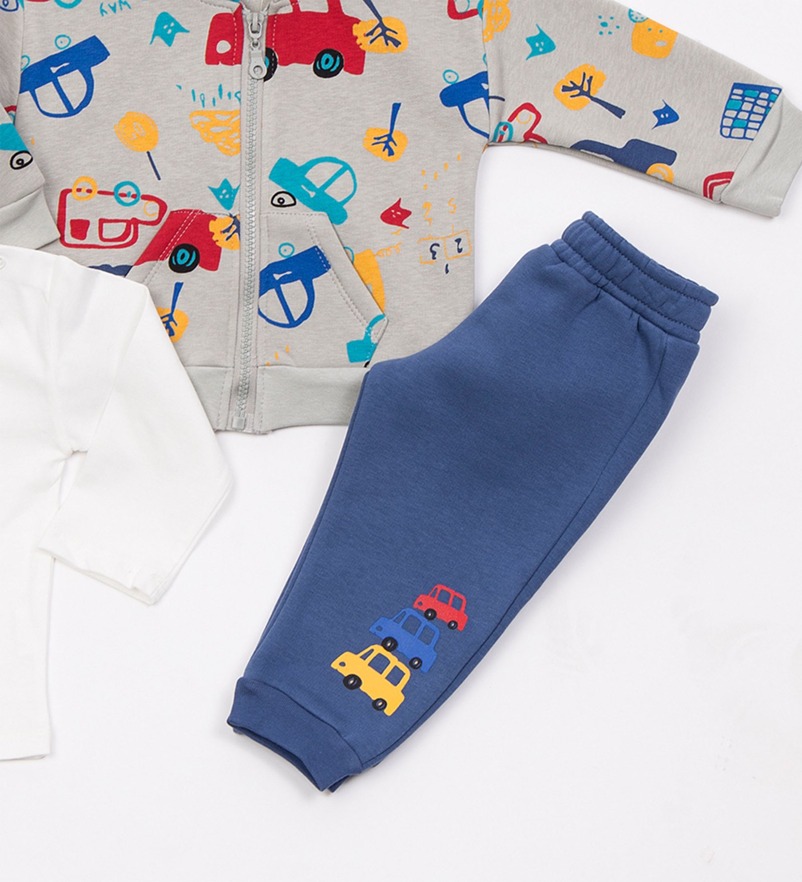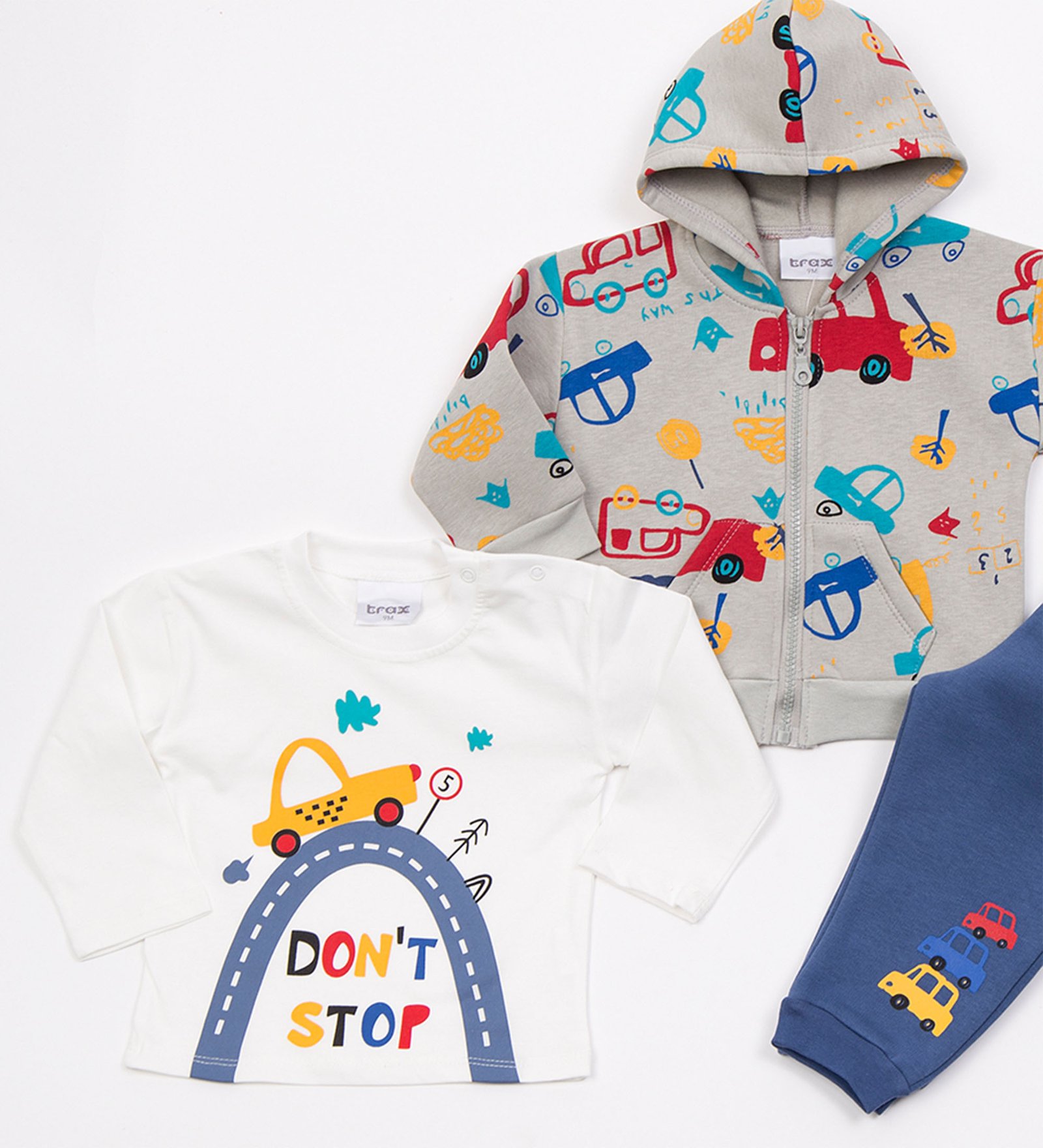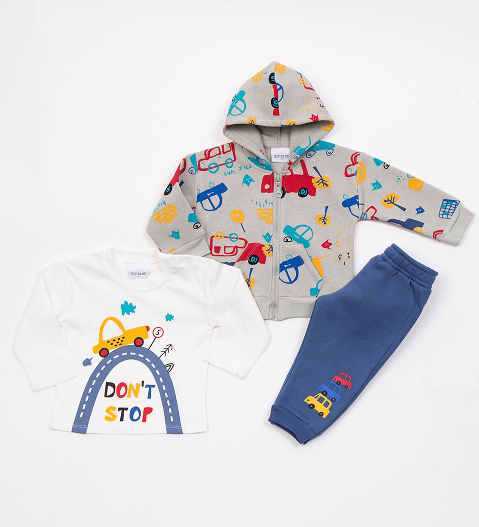 Βρεφικό σετ 3 τεμαχίων για αγόρι της εταιρείας Trax. Το σετ αποτελείται από ζακέτα με κουκούλα, μακρυμάνικο μπλουζάκι και παντελόνι φόρμα.
