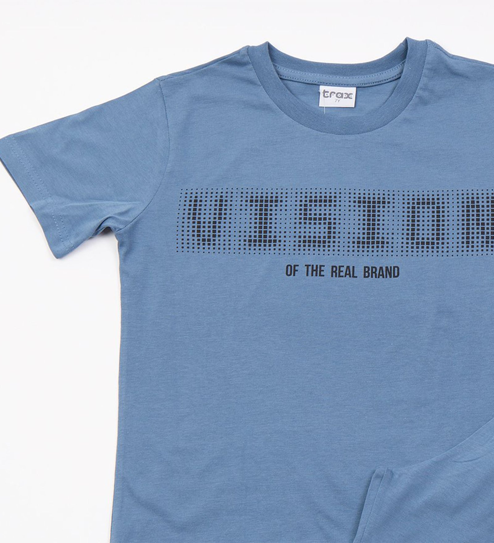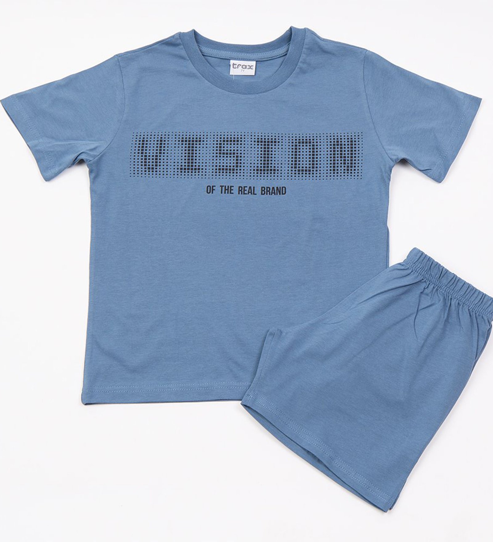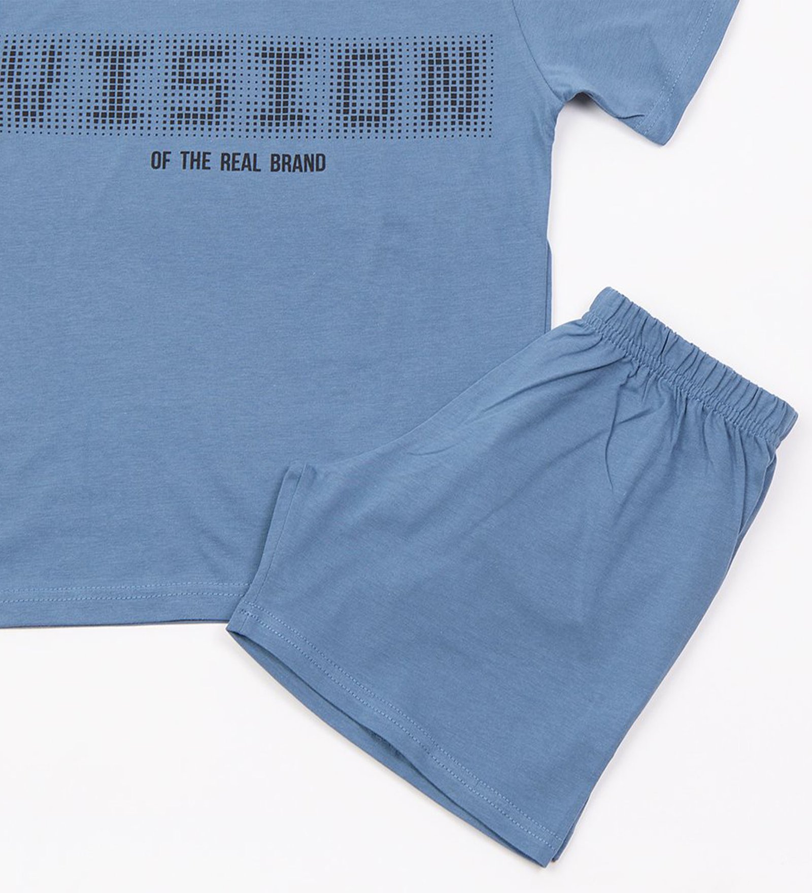 Παιδικό καλοκαιρινό σετ πιτζάμες σε μπλε απόχρωση, με κοντομάνικη μπλούζα με διακριτικό τύπωμα και άνετο σορτσάκι με λάστιχο στη μέση.