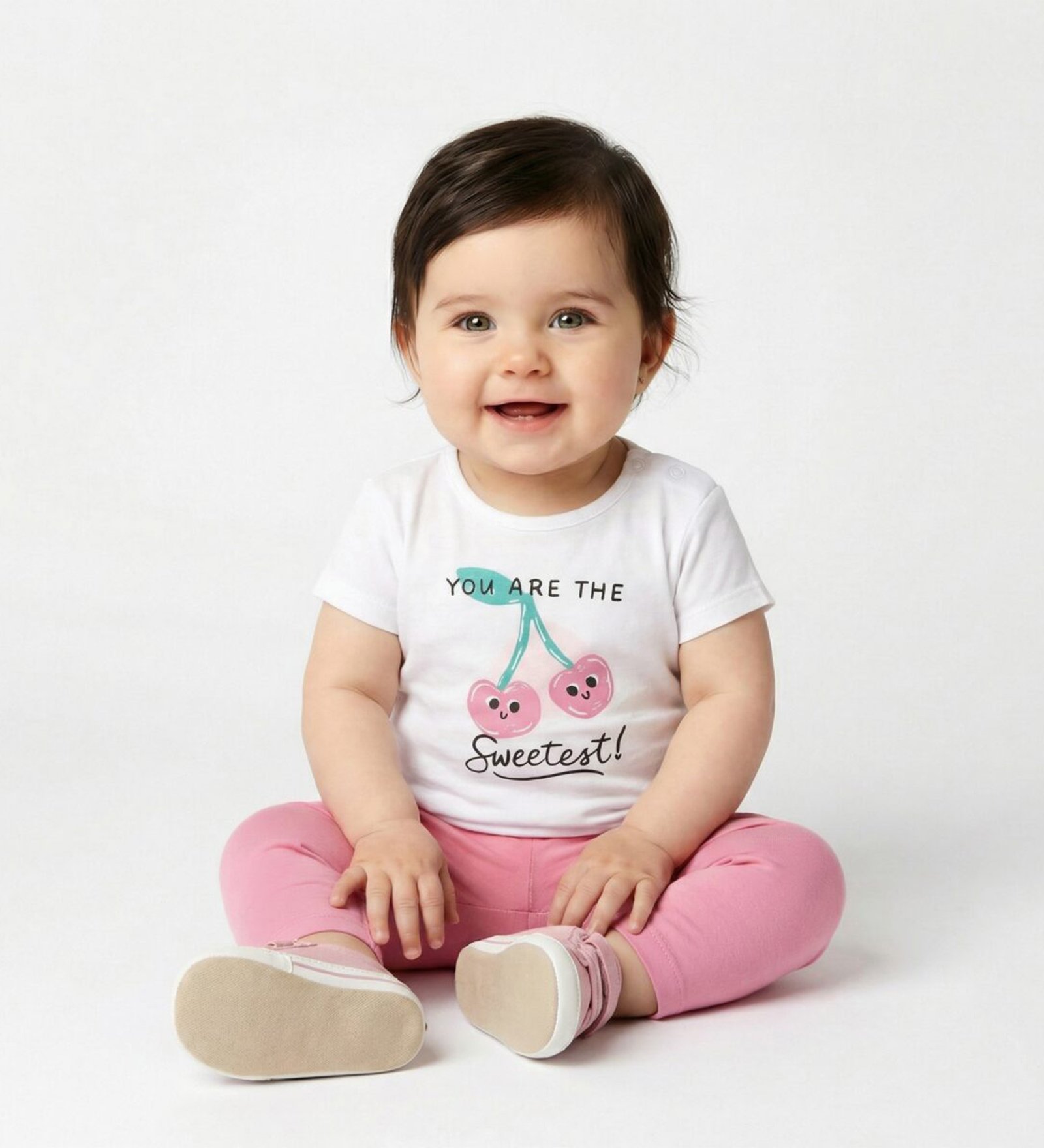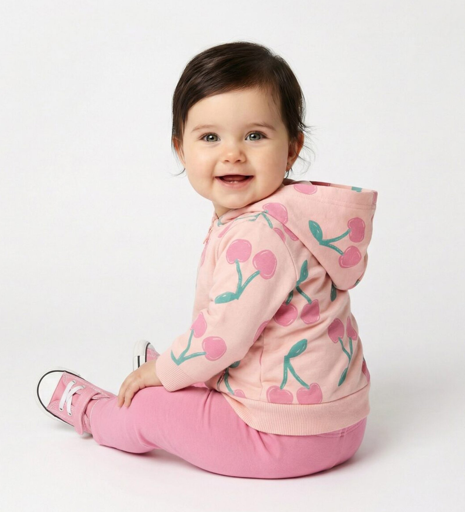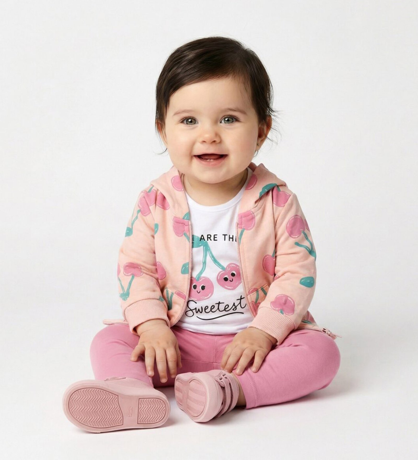 “Trax” Σετ τριών τεμαχίων. Σετ που αποτελείται από ροζ ζακέτα με φερμουάρ, λευκή μπλούζα με χαρούμενο τύπωμα κερασάκια και κολάν ροζ απόχρωση.
