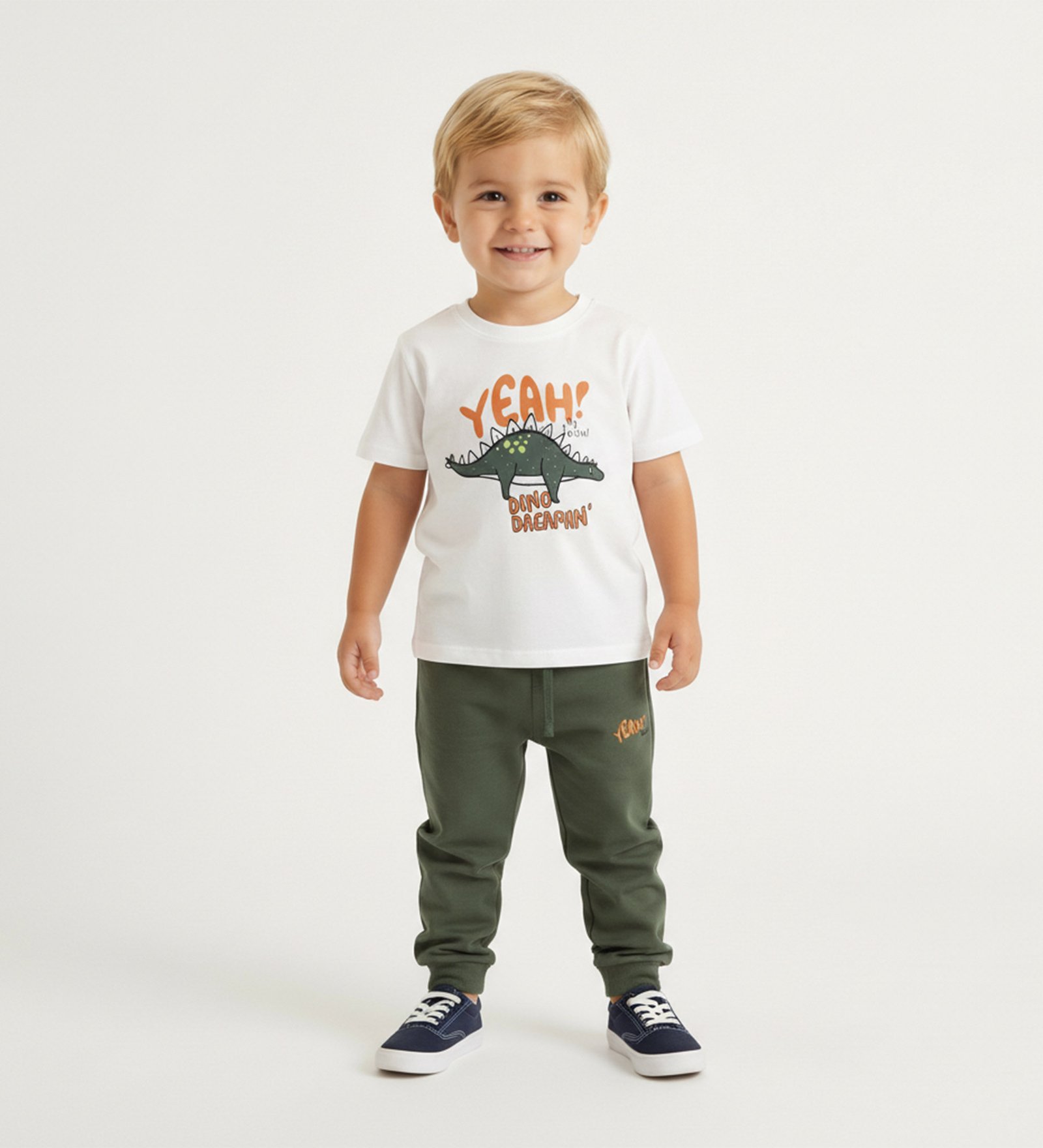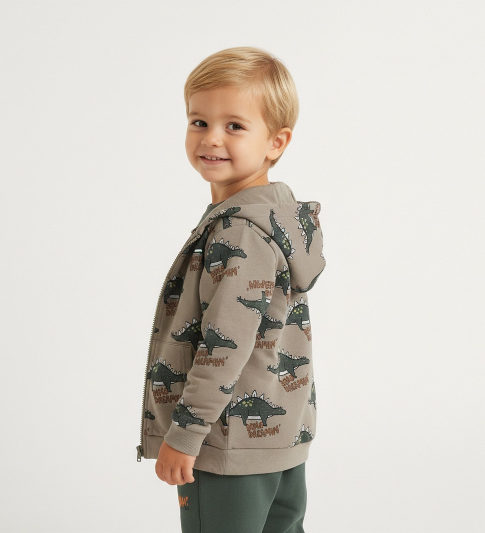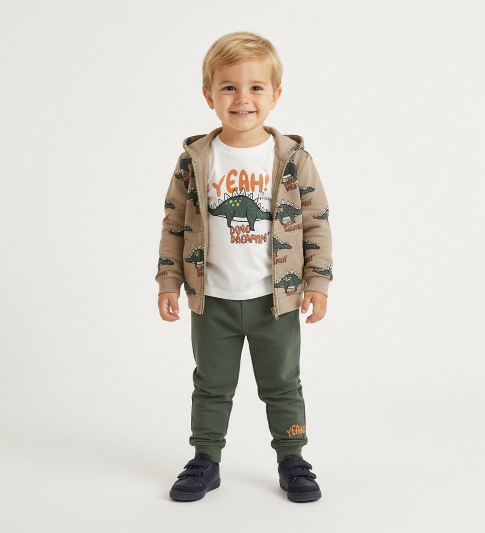 Παιδικό σετ που περιλαμβάνει ζακέτα με κουκούλα και σχέδιο δεινοσαύρους, λευκή μπλούζα με στάμπα και άνετο παντελόνι φόρμας σε πράσινη απόχρωση, ιδανικό για καθημερινές και παιχνιδιάρικες εμφανίσεις.