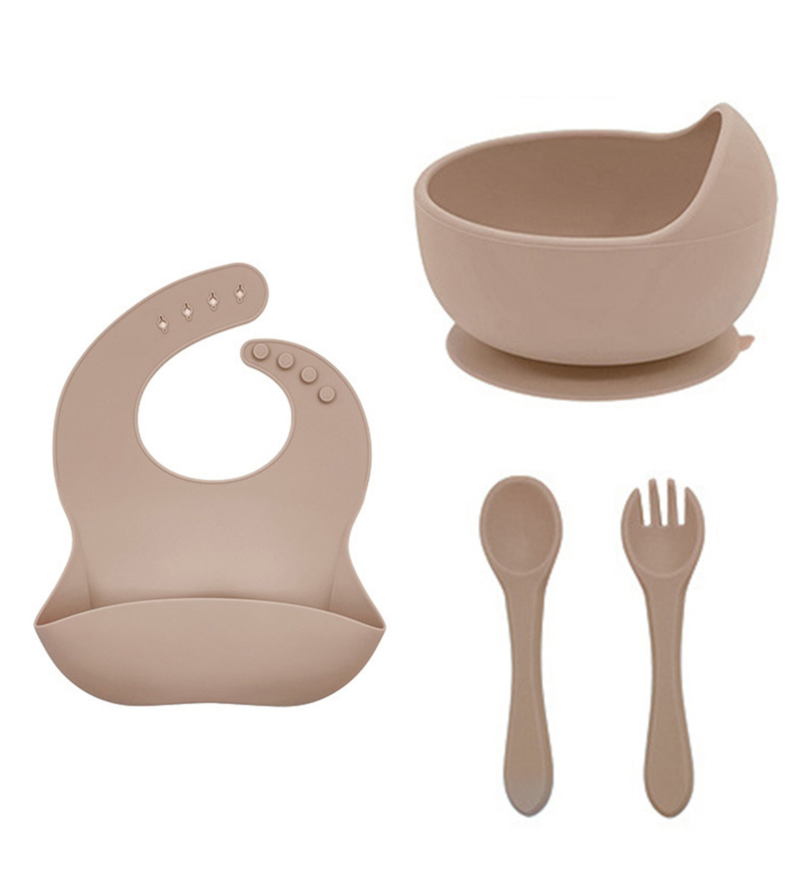 Σετ φαγητού για μωρά από σιλικόνη σε μπεζ χρώμα, που περιλαμβάνει σαλιάρα με θήκη συλλογής τροφών, μπολ με βεντούζα στη βάση, κουτάλι και πιρούνι.