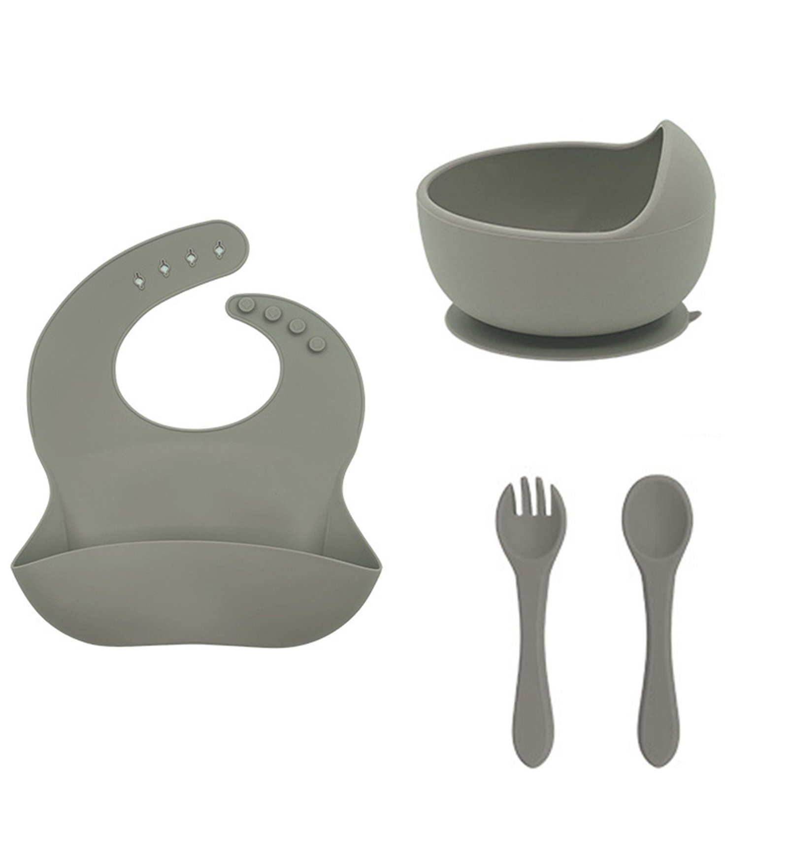 Σετ φαγητού για μωρά από σιλικόνη σε χακί χρώμα, που περιλαμβάνει σαλιάρα με θήκη συλλογής τροφών, μπολ με βεντούζα στη βάση, κουτάλι και πιρούνι.