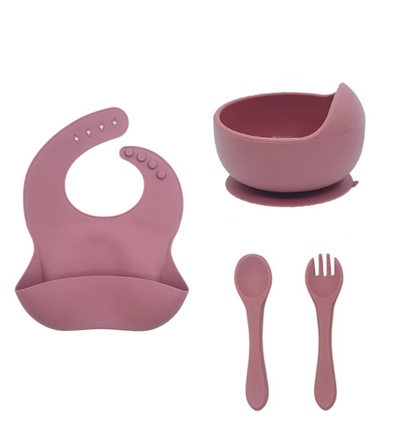 Σετ φαγητού για μωρά από σιλικόνη σε μπορντώ χρώμα, που περιλαμβάνει σαλιάρα με θήκη συλλογής τροφών, μπολ με βεντούζα στη βάση, κουτάλι και πιρούνι.
